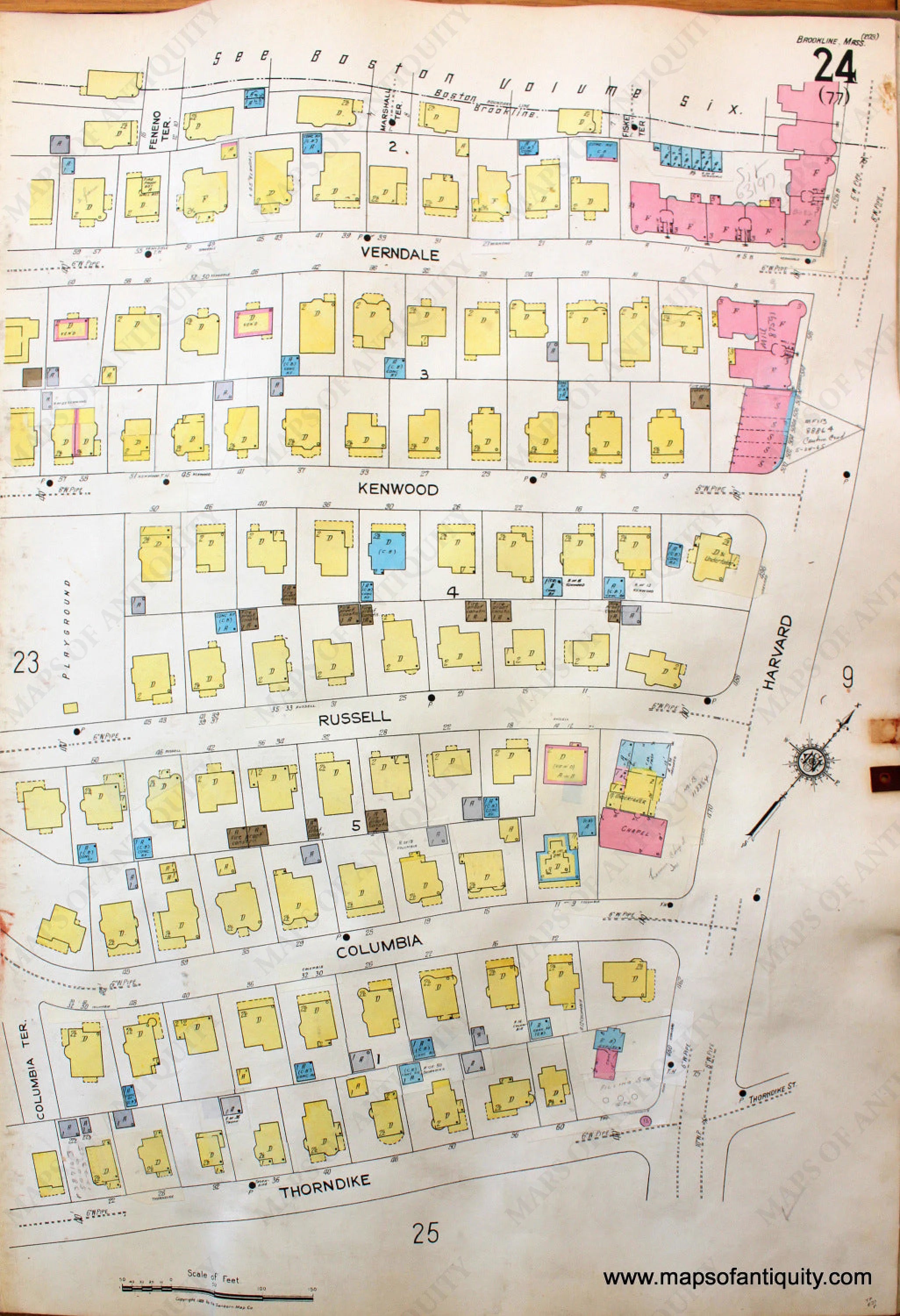 Antique hand colored map showing Wards 24 and 25, part of Brookline, Massachusetts, from the Brookline Mass. Atlas by the Sanborn Map Company of New York, 1925. Ward 24: Streets shown in this map are Verndale, Kenwood, Russell, Columbia, Thorndike, and Harvard. The landmarks in this ward are the Coolidge Playground, a filling station, a chapel, and two undertakers. Most of the buildings in this ward are dwellings or flats, excluding some storefronts on Harvard. Reverse side of this map shows Ward 25 of Brookline. Streets shown on this side are Thorndike, Coolidge, Fuller, Williams, Centre, Winchester, and Harvard. The landmarks in this ward are the Wynchester Gardens, the Temple Kehllath Israel with attached auditorium and community house, the chapel and conjoined undertaker on Harvard and Fuller, the Private rest home on Coolidge, and the Dog Hospital also on Coolidge. There are also many stores along Harvard. This map was added to and corrected over time to update buildings and streets. There are small rectangles of paper with updates glued to the page and the updates were recorded and signed in a table at the front of the atlas. Fair Antique condition; page is wavy, few pencil marks from updates, some light toning at edges, edge has red leather atlas tab and an imprint from another atlas tab. Pencil marking can potentially be removed. Approx. 26.5" x 18".
