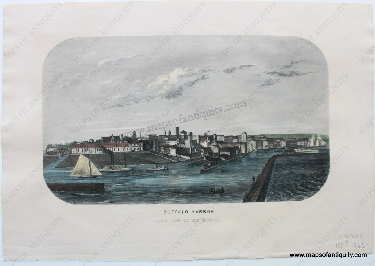 Hand colored antique print showing a scene on Lake Erie, apparently looking toward Buffalo from the light house. Very good condition with a few tiny spots. Recent color. Approx. 4.25 x 7.5 inches to the image edges not including title.