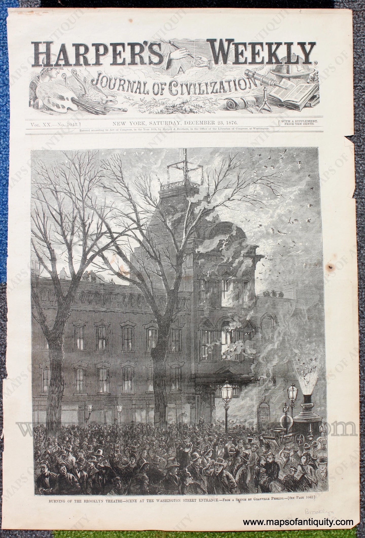 Antique black and white print published in Harper's Weekly on December 23, 1876. Can be hand colored by our professional colorist for an additional charge. Text on back is slightly visible through the page. Overall good antique condition with toning, some minor stains, edge wear, darkening in areas, and slight creases/wrinkles in the paper. Should look good if framed. Page dimensions are approx. 16.25 x 11 inches. Note: any "rainbows" or strange patterns in the image are called moire pattern- caused by taking a digital photo or scan of the many parallel lines in the print- these are not in the print and we can try to take more photos if you are concerned.
