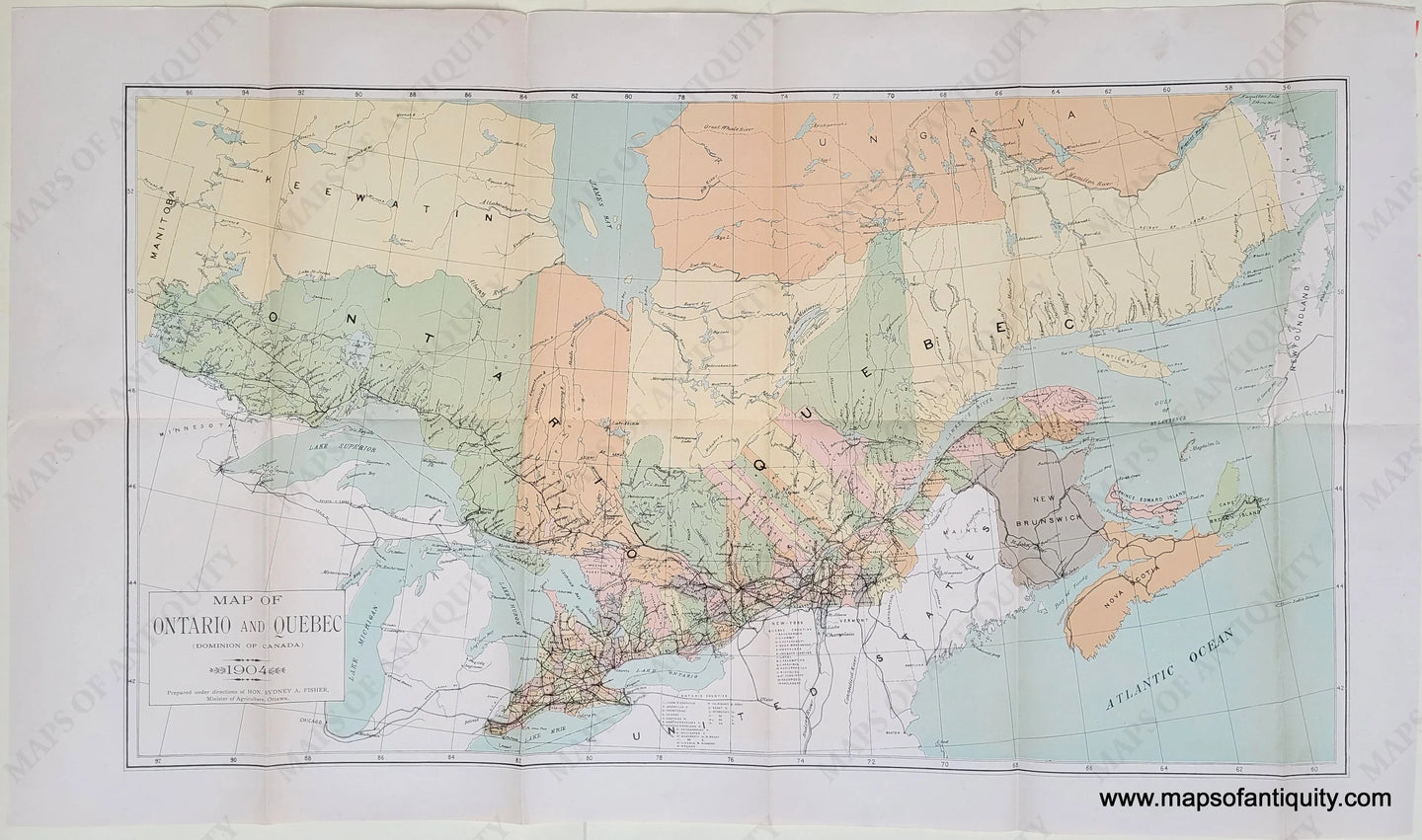 Antique printed colored map of part of Canada, including Ontario, Quebec, New Brunswick, Nova Scotia, and parts of Keewatin and Ungava. Prepared under the direction of Hon. Sydney A Fisher, Minister of Agriculture, 1904. Shows rivers, lakes, railroads, some towns, and cities. With folds as issued. Very good condition with some small separations at fold intersections. Measures approx. 13.5 x 24 inches to the neatline.