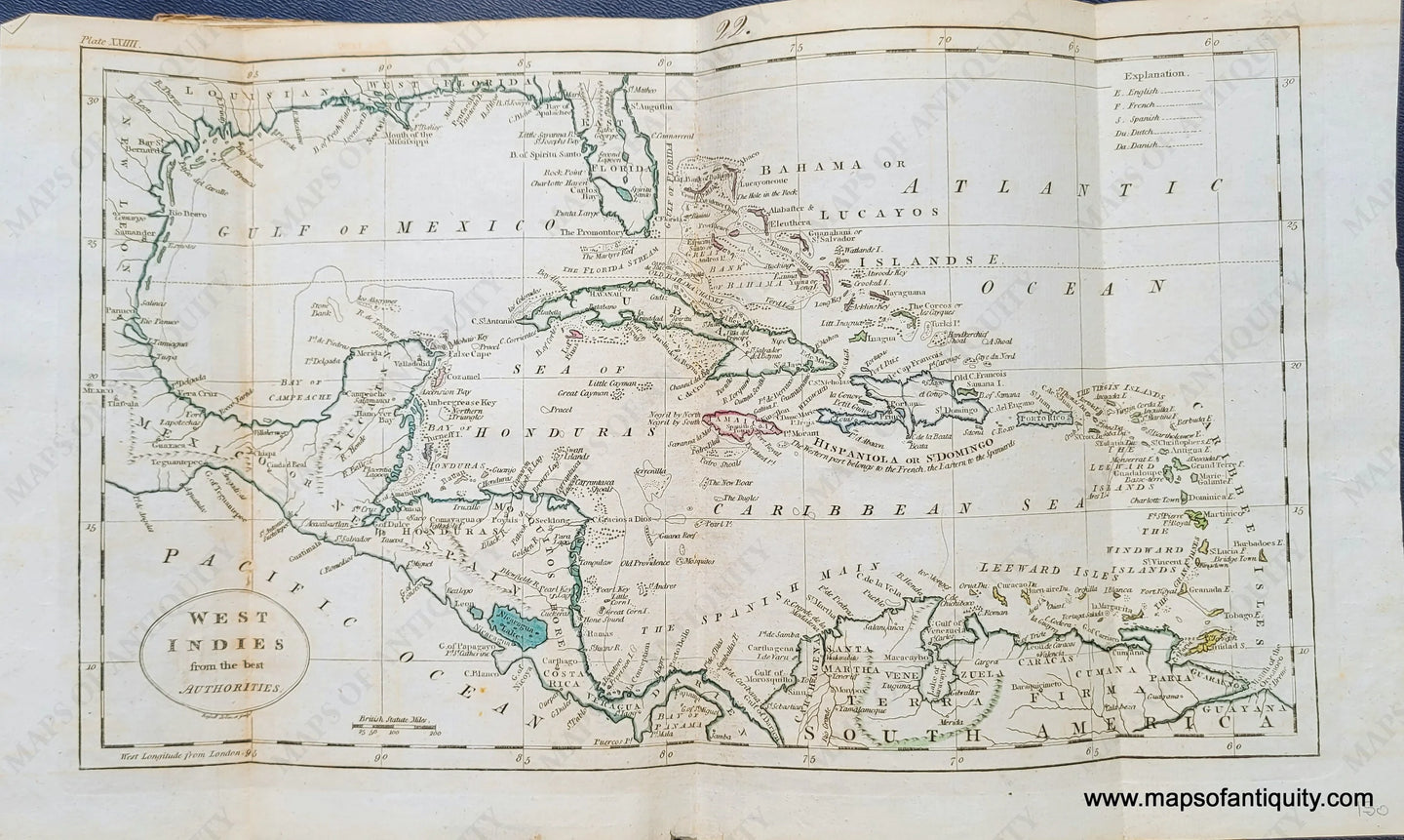 Antique map engraved by Russell and probably from a Guthrie atlas, c. 1800. Hand-colored. With East and West Florida, Bahamas, the Cayman Islands, Hispaniola, the Virgin Islands, the Caribbee Isles, Central America, and part of South America. Very good antique condition with mild toning, and some minor spots. Measures approx. 7.25 x 12.75 inches to the neatline.