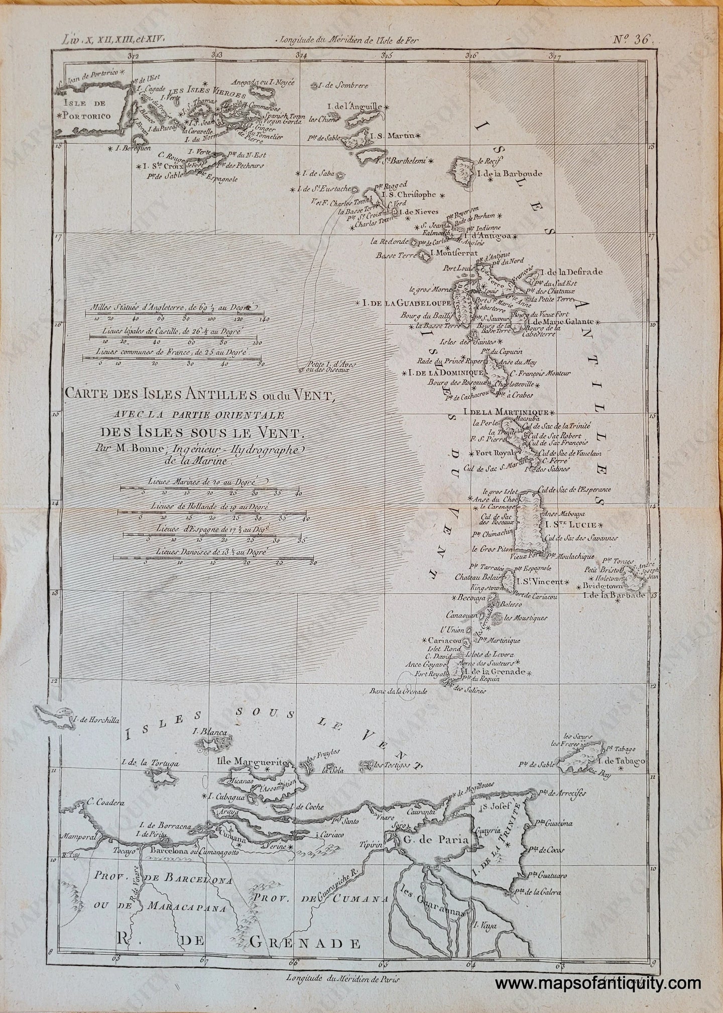 Antique uncolored map of Isles of the West Indies or Windward, with the Eastern Part of the Leeward Isles, From the "Atlas de Toutes les Parties Connues du Globe Terrestre, Dresse Pour l'Histoire Philosophique et Politique des Etablissemens et du Commerce des Europeens dans les deux Indes." By Raynal and Bonne, 1780. With fold as issued. Visible plate mark. Very good overall antique condition, with some mild toning, some very minor foxing spots. Measures approximately 12.5" x 8" to the neatline.