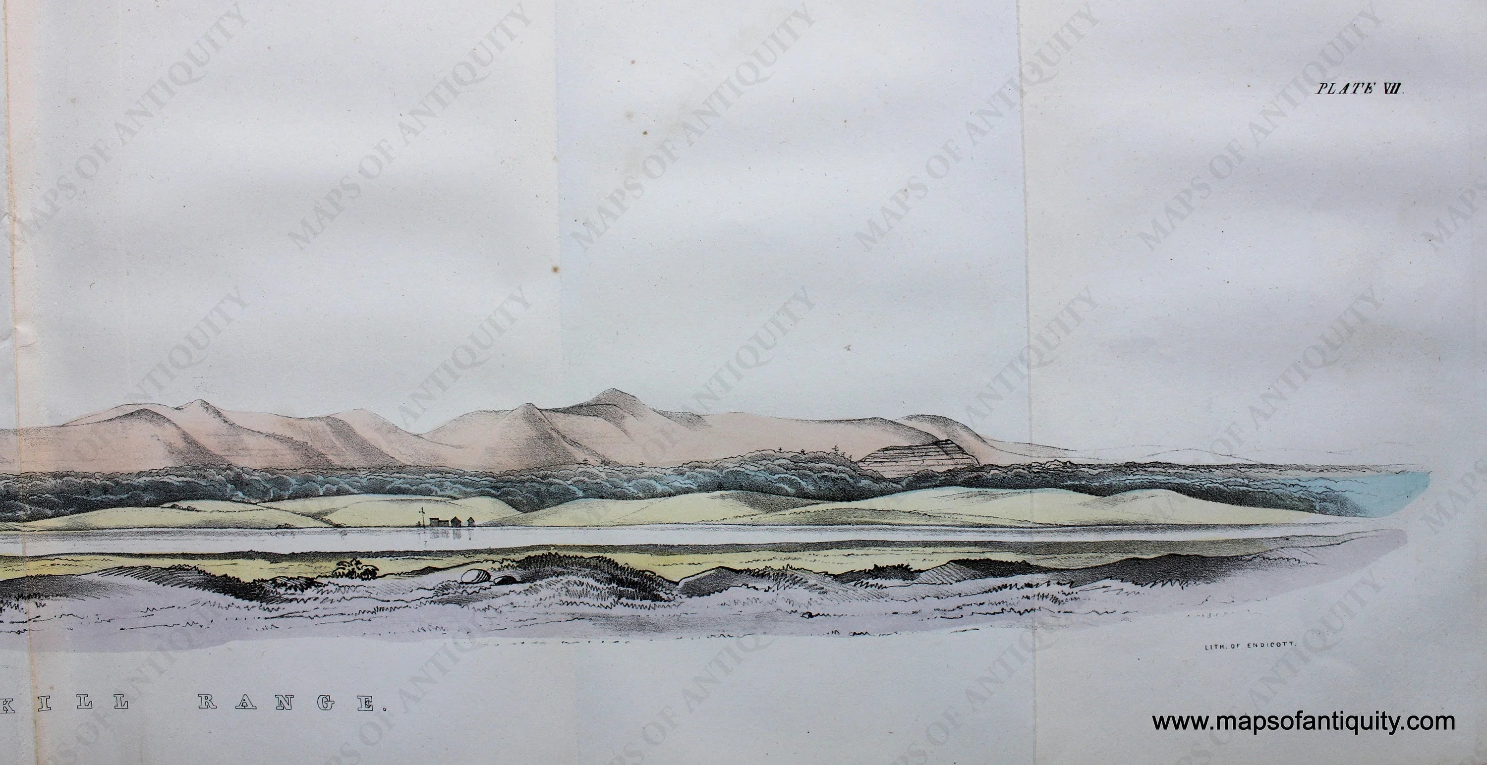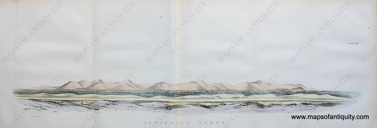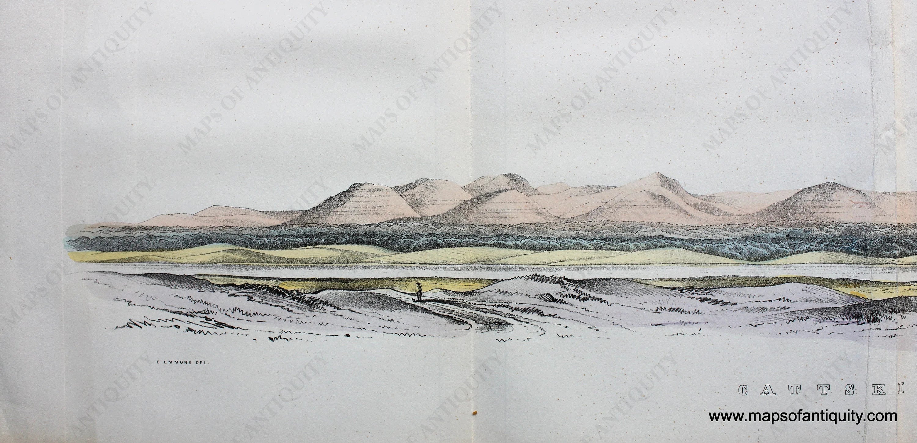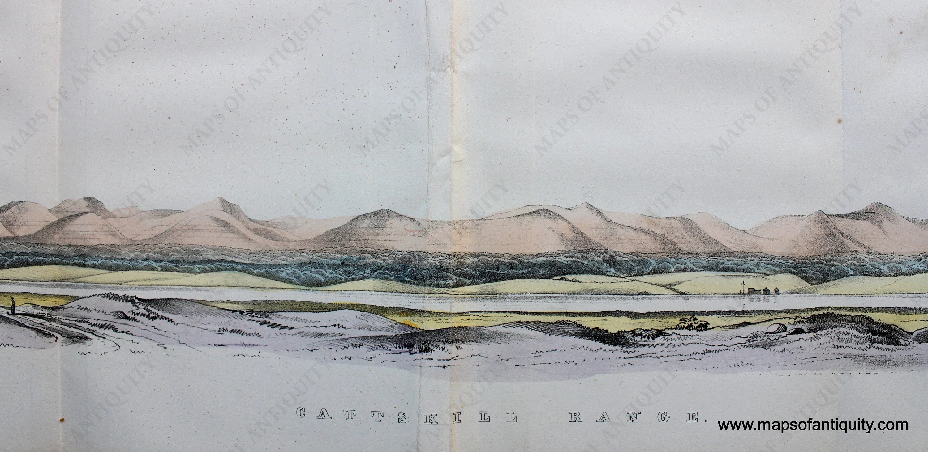 Hand colored antique engraving of a beautiful view of the Catskill mountain range by E. Emmons, Natural History of New York, 1842. Good condition, minor foxing, folds as issued, approx. 9 x 30 inches.