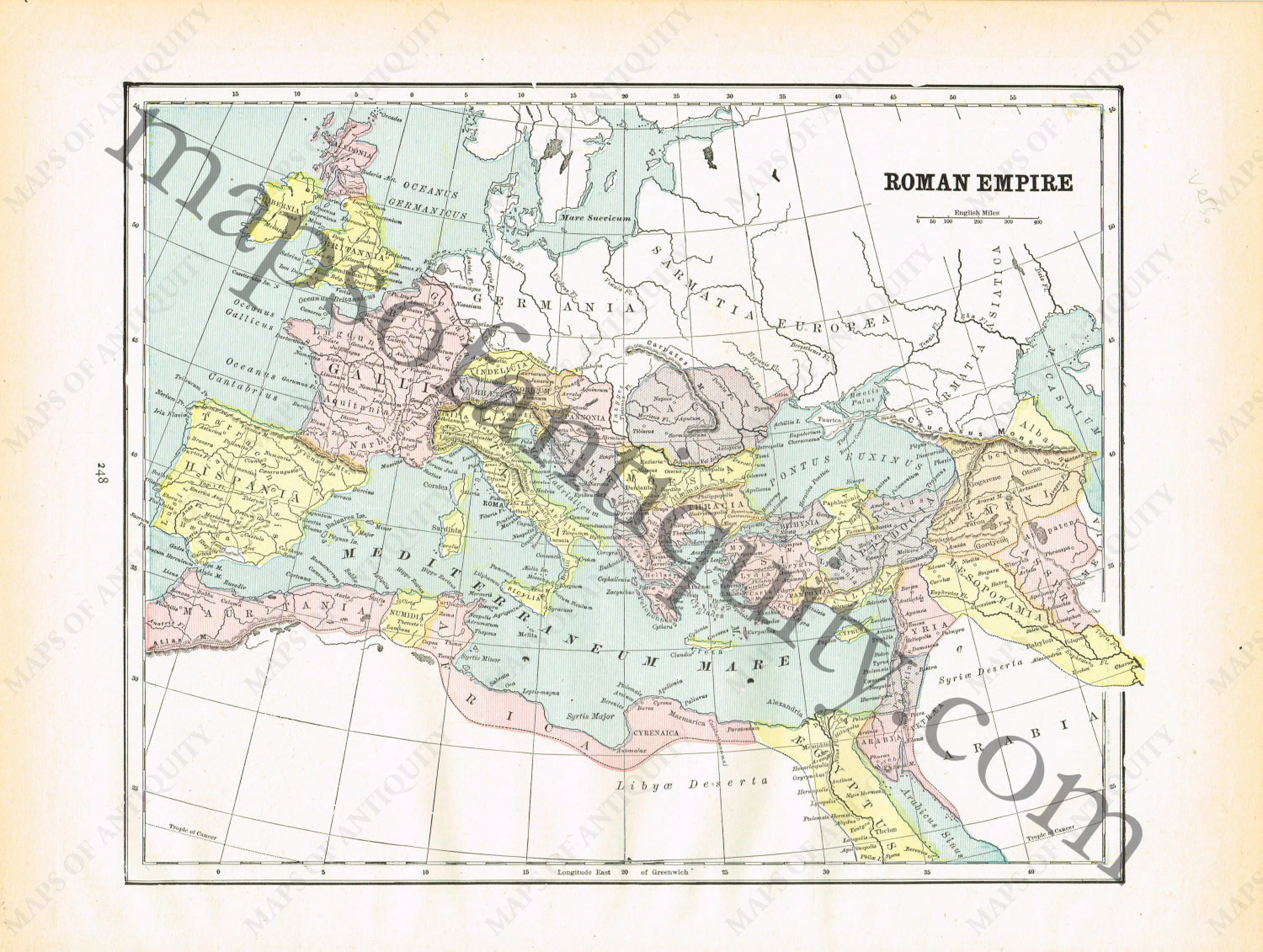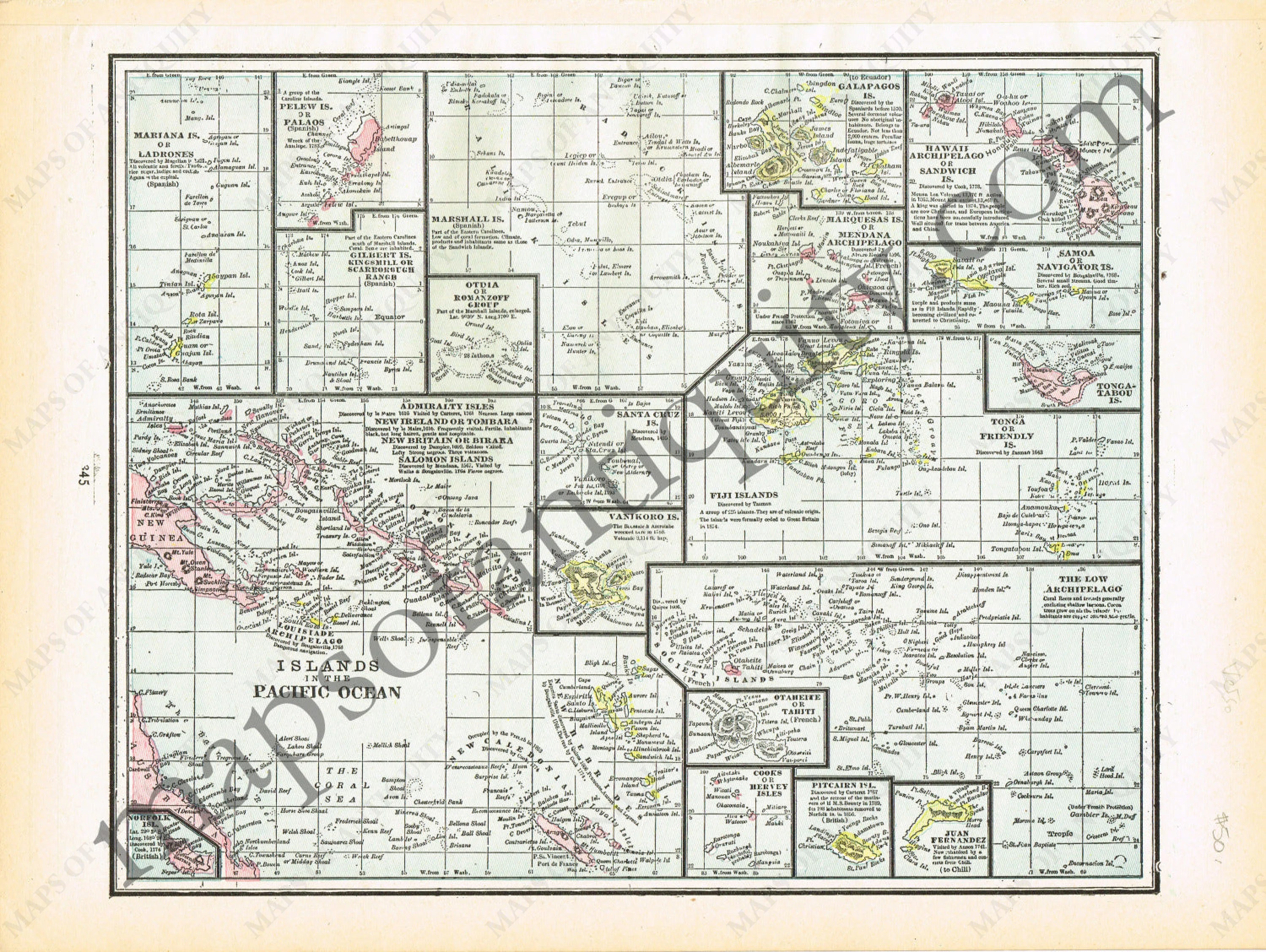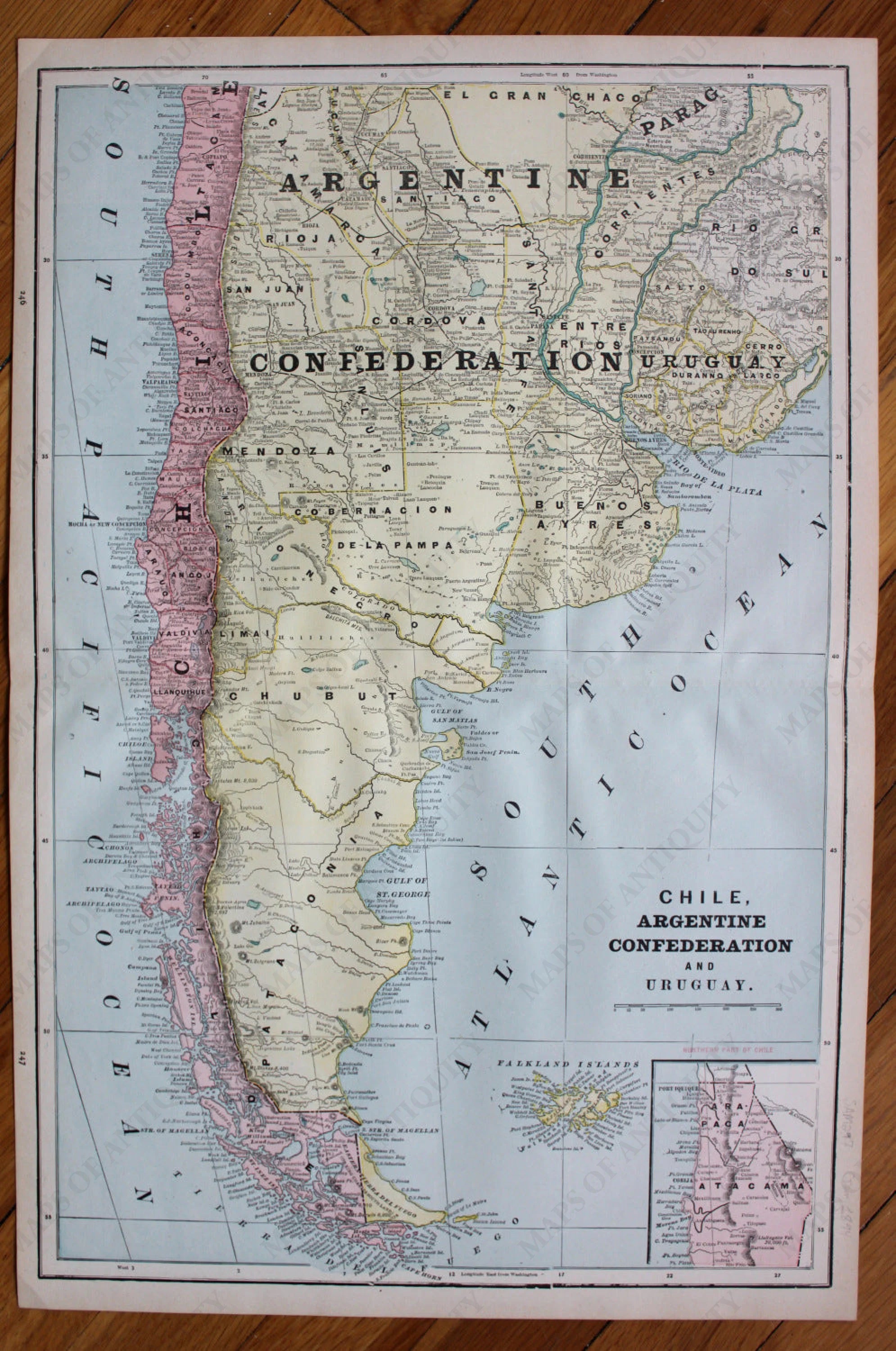Antique printed color map of South America (recto map, double-page spread, 246 & 247) featuring Chile, Argentina and Uruguay including Falkland Islands and inset of the Atacama Desert. Verso Map: Islands in the Pacific Ocean (page 245). Verso: Map of the Roman Empire (page 248) Very good condition with some slight toning at the edges. By Cram, in The Standard Atlas and Gazetteer of The World, 1894. Recto Map: Approximately 20.5" x 13.5" to the neatline. Verso Maps: Approx. 9" x 11.5" to the neatline.