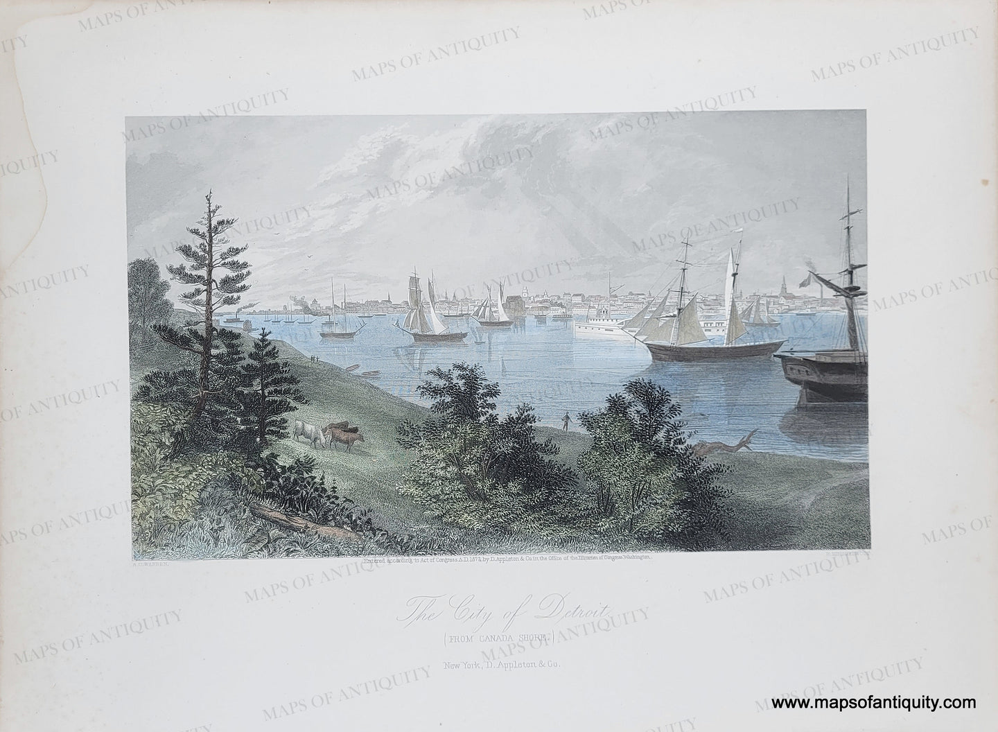 Antique steel-plate engraving print of the City of Detroit, Michigan, by Appleton, from Picturesque America, image is 9"w x 5 1/2" h, page is 12 1/2"w x 9". Very good overall antique condition, outer margin has some water stains on left margin. Note: any "rainbows" or strange patterns in the image are called moire pattern- caused by taking a digital photo or scan of the many parallel lines in the print- these are not in the print and we can try to take more photos if you are concerned.