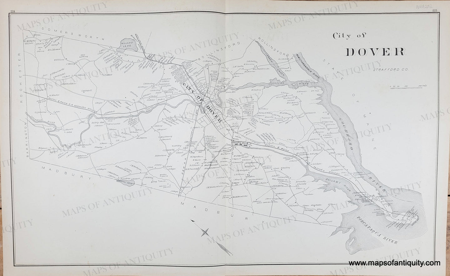 Antique black and white map of Dover, New Hampshire. From the Town and City Atlas of the State of New Hampshire, by D.H. Hurd, 1892. Includes the names of property owners at the time of publication. The most densely populated area is enlarged separately. Center fold, as issued. Very good antique condition with mild toning of the paper and a few spots of minor foxing/soiling. Measures approx. 26.25 x 16 inches.