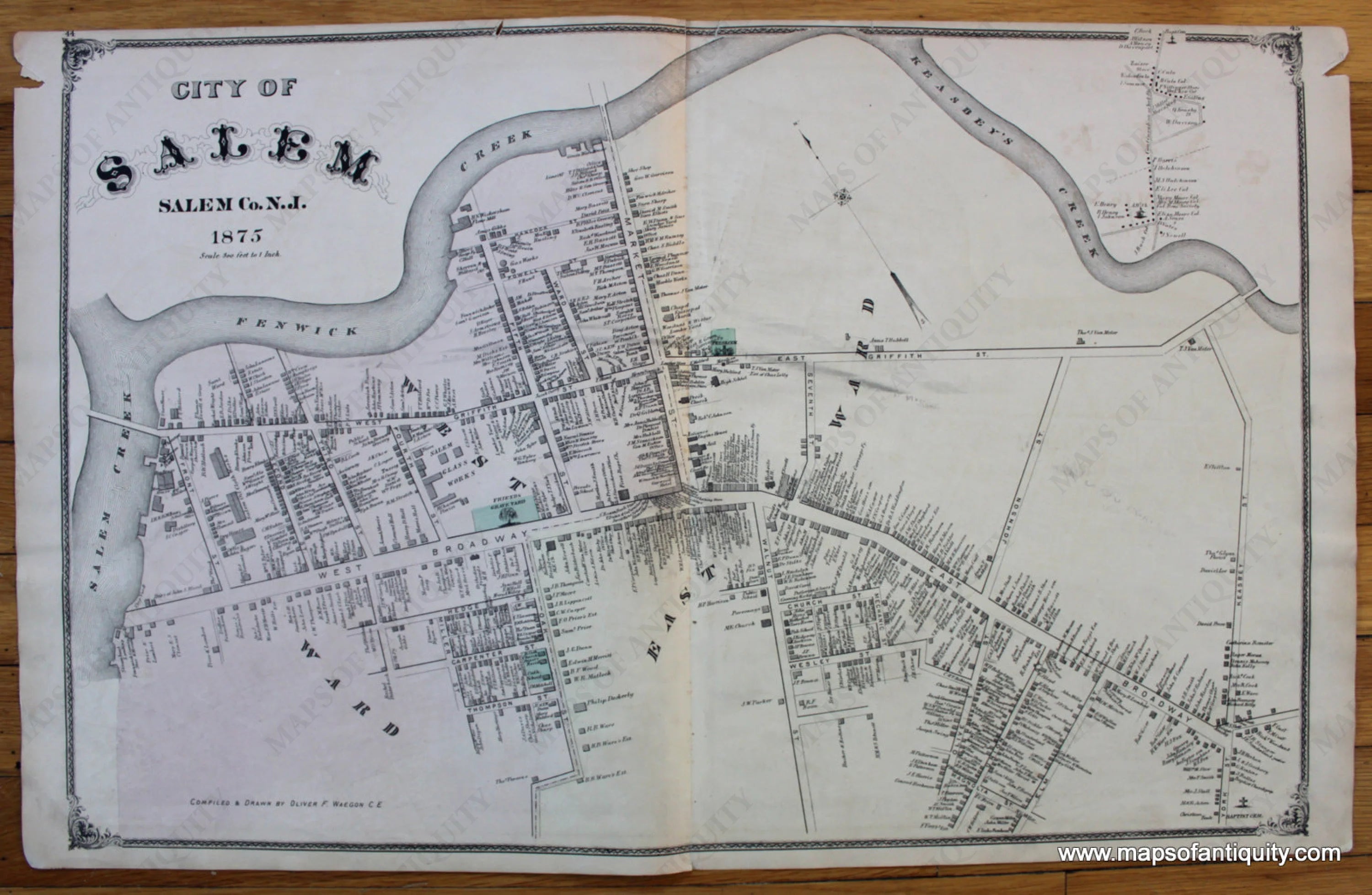 Antique hand colored map of Salem in Salem County, New Jersey, from the New Historical Atlas of Salem & Gloucester Counties by Everts & Stewart, 1876. Shows major roads, bodies of water, buildings with property owners names, and more. Versos feature illustrations of various farms and residences, as well as two advertisements. Attractive decorative border. Good antique condition with overall toning, some minor stains, and some wear and tears at the paper edges. Slight seam separation that is not into the map. Should frame nicely. Approx. 16 x 25.25 inches to the neatlines.