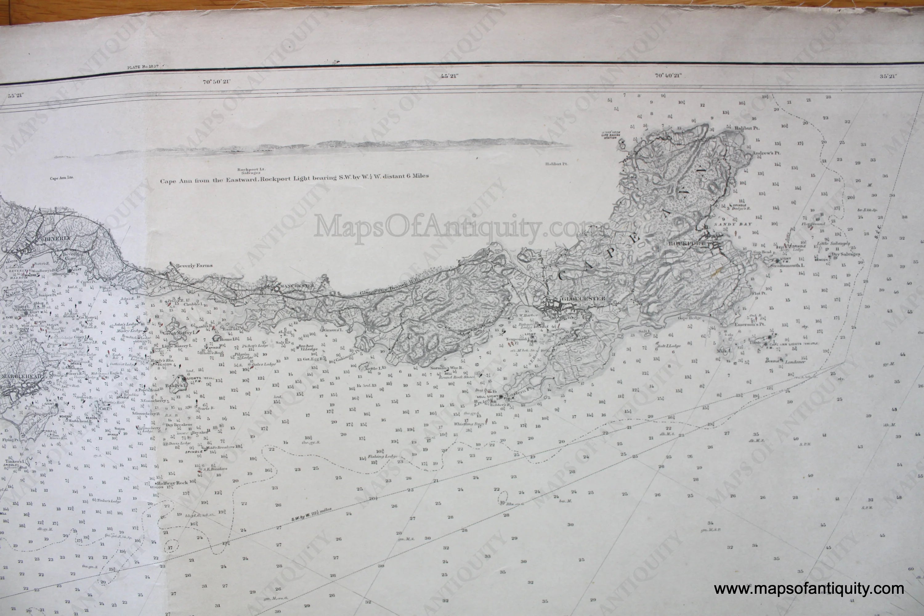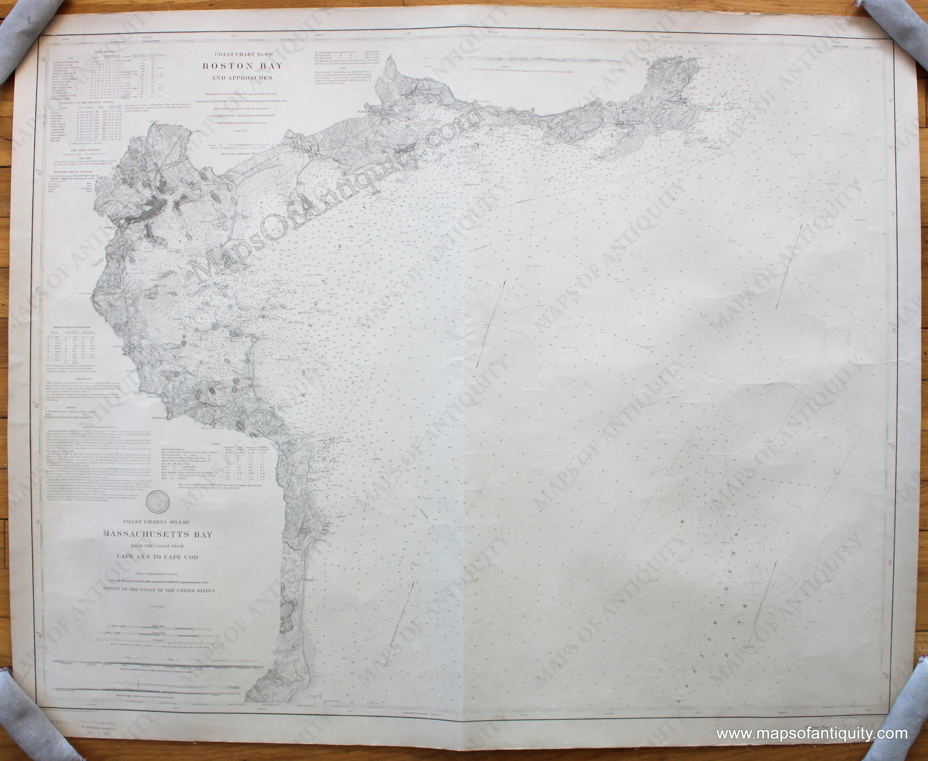 Black and white antique coastal chart, first published in 1877 with additions to 1892, stamped printed Nov.1. This is part of a two chart set that covers the coast from Cape Ann to Cape Cod. The coordinating chart can be seen by searching our website for MAS294. Very good overall antique condition, with soundings, and information on tides, light houses, buoys, tides. Approx. 30.75 x 38.5 inches. **NOTE- because this map requires extra insurance for shipping, an additional charge will appear on your card after your original purchase. If you would like to know what that charge will be, please contact us.**