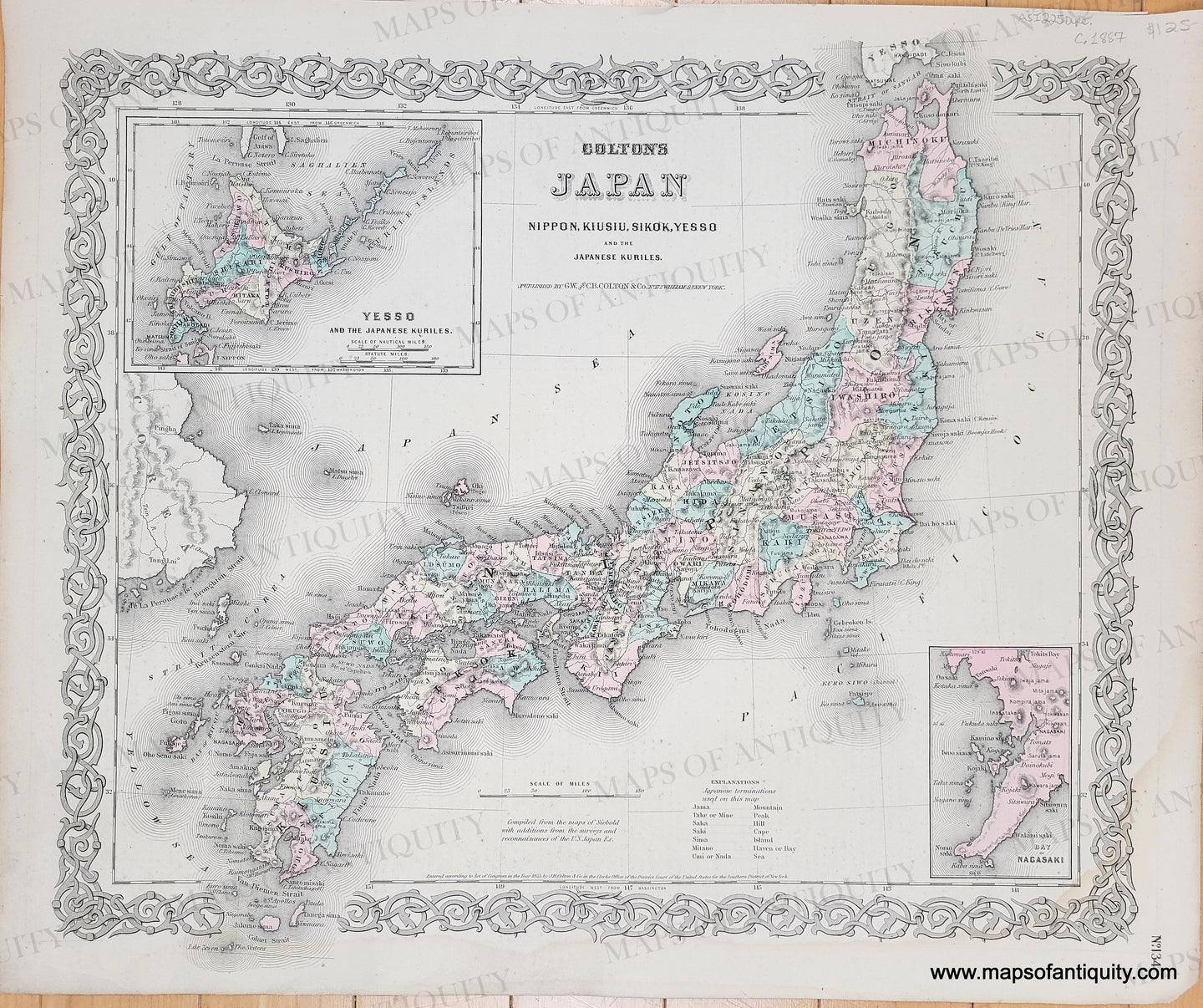 Antique hand-colored map by Colton, circa 1855, with insets of Yesso and the Japanese Kuriles. Shows regional borders, routes, cities, mountains, and bodies of water. The Colton firm refused to compromise quality, choosing to compete for sales in the finer quality international market rather than the inexpensive domestic one. Because of this, all maps were engraved by steel plates rather than by wax engraving which was the most common method used at this time. Good Antique Condition, paper is toned overall, some wear and small tears at the paper edges. Measures approx. 13 x 16 inches. Priced based on condition.
