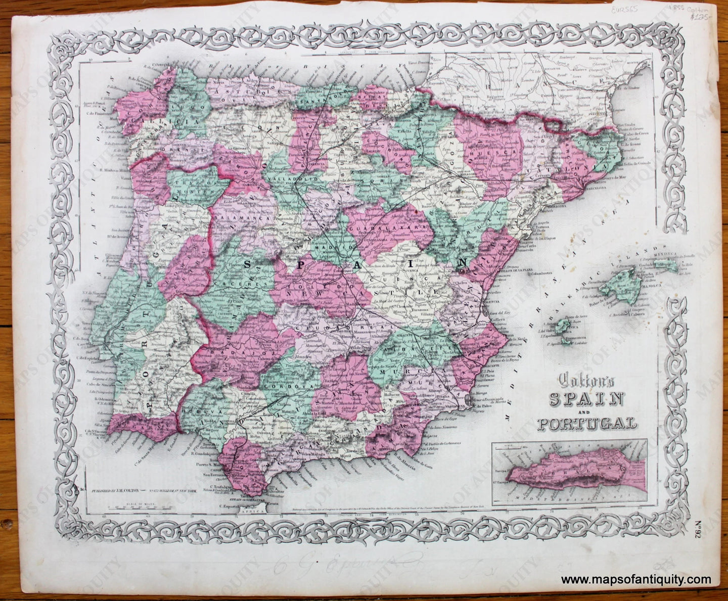 Antique hand colored map of Spain and Portugal by Colton, 1855, with inset of Gibraltar, condition good, paper is toned overall, approx. 12.75 x 15.75 inches.