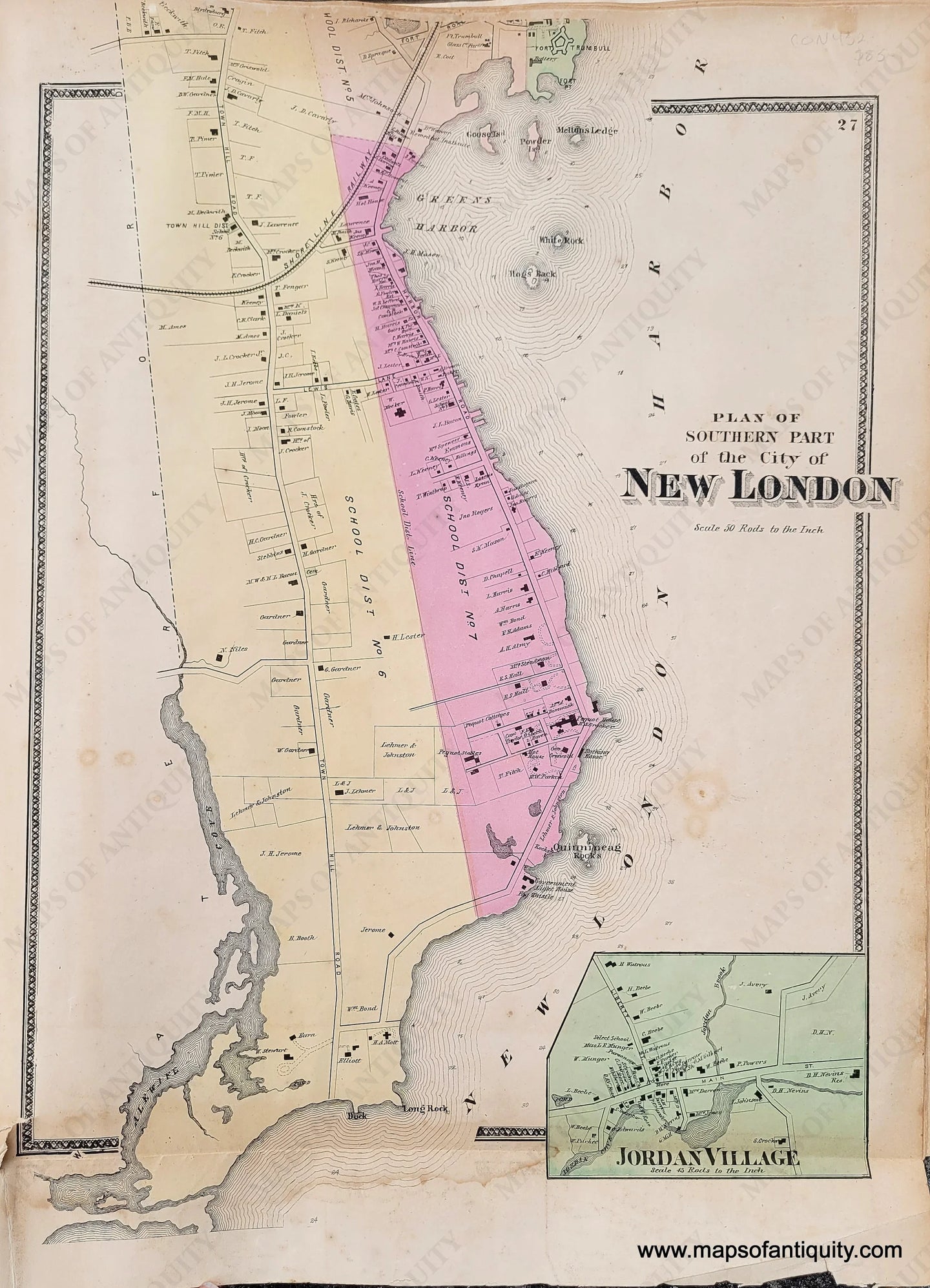 Antique hand colored map of the Southern Part of the City of New London CT, from the Atlas of New London County, Connecticut, published by Beers, Ellis & Soule in 1868. Shows roads, railroads, village centers, some topography, and more. Includes names of property owners of the time. With inset map of Jordan Village. Fold at bottom as issued. Fair to good condition with some spots and stains and some wear and tears at the paper edges. Measures approx. 15 x 12 inches to the neatline with the map extending notably outside of the neatline.