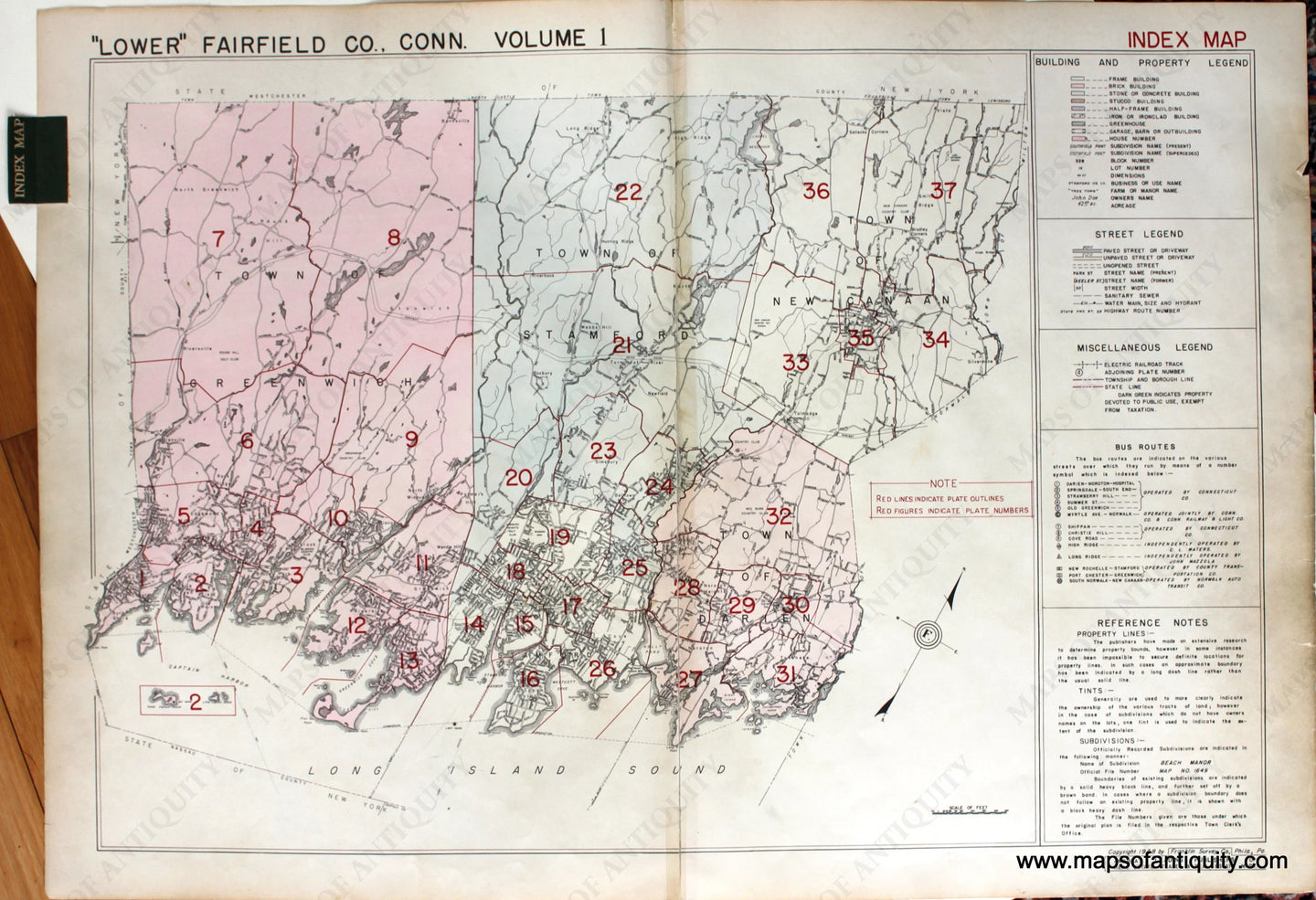 Antique Index map from the Property Atlas of "Lower" Fairfield County Connecticut, Volume One, published by the Franklin Survey Company, 1938. The red numbers indicate the number of the plate upon which that area is mapped. Fair to good antique condition with a repaired seam separation that spans the majority of the fold, old tape along the center fold on the face of the map, and other minor signs of age. Leather tab on left side of page could be removed or hidden for framing. Measures approx. 21 x 31 inches to the neatline including the legend on the right side.