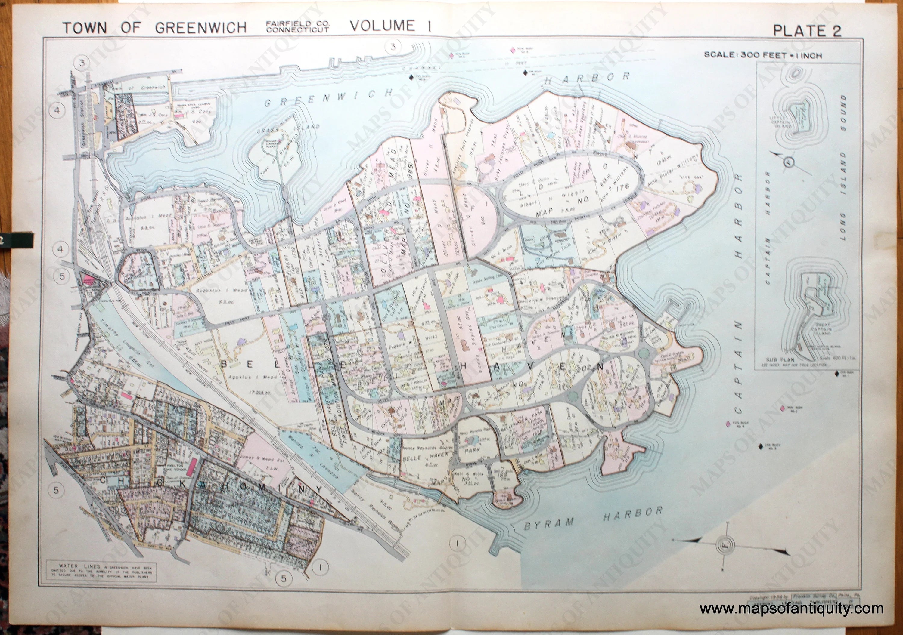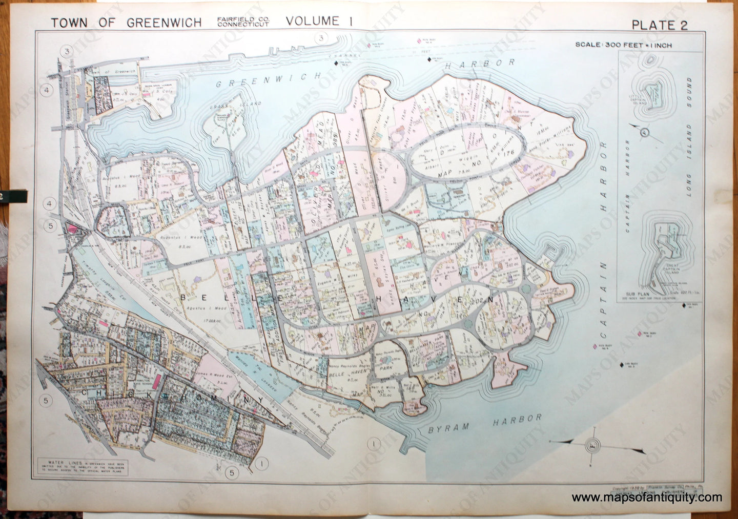 Antique map from the Property Atlas of "Lower" Fairfield County Connecticut, Volume One, published by the Franklin Survey Company, 1938. This map shows part of Greenwich CT including Greenwich Harbor, Belle Haven, Captain Harbor, and Chickahominy with a sub-plan of Little and Great Captain Islands. Includes roads, railroads, housing developments, and property owners names. Vibrant original color. Leather tab on left side of page could be removed or hidden for framing. Good antique condition with minor signs of age, such as small, mild stains, some minor damage at the paper edges. Measures approx. 21 x 31 inches to the neatline.