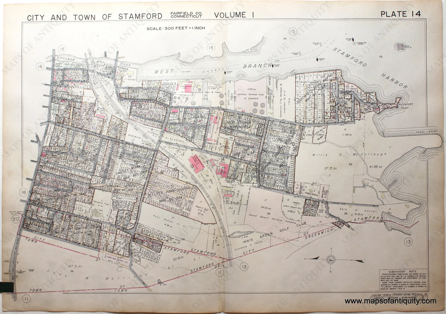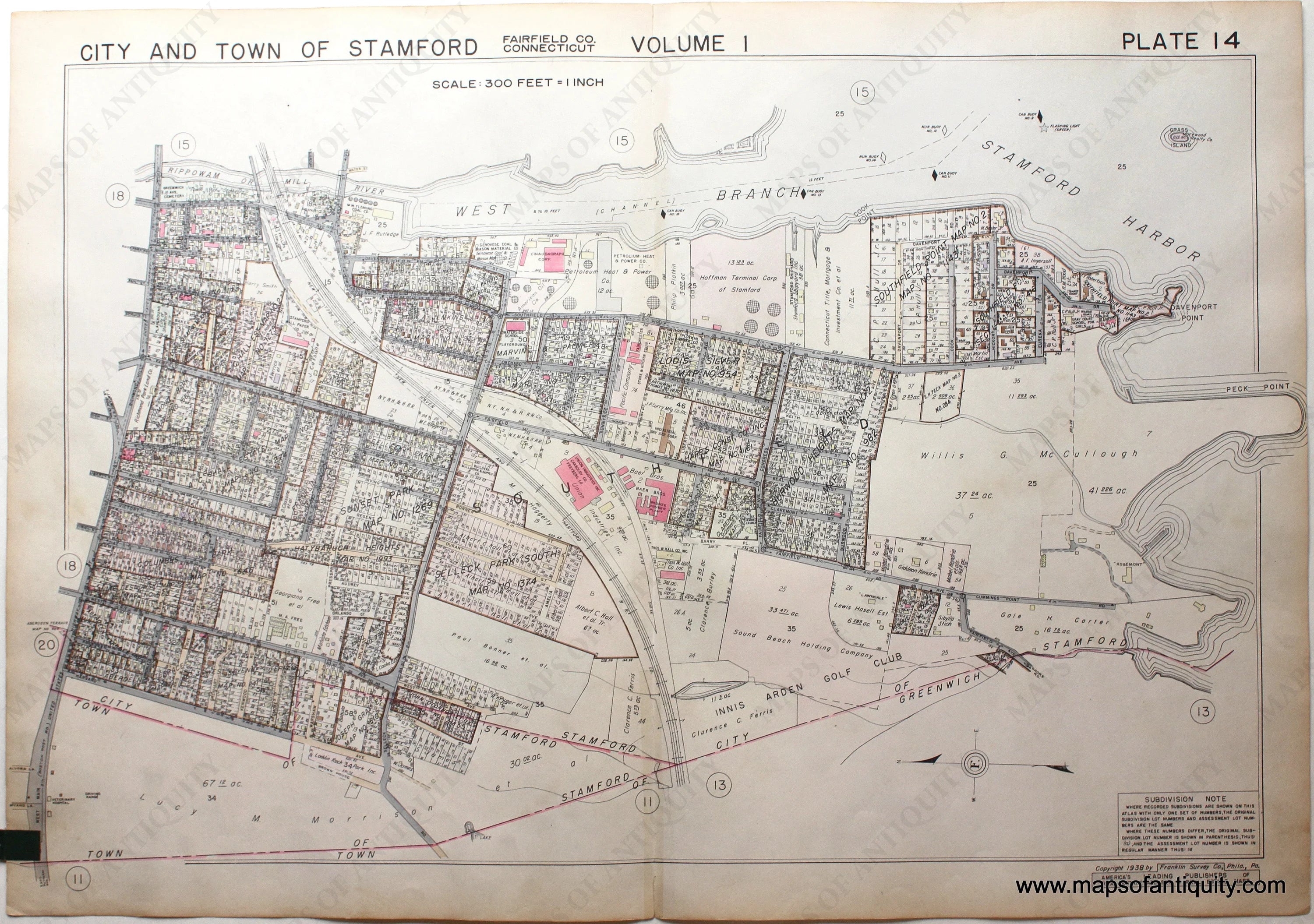 Genuine-Antique-Map-Part-of-City-and-Town-of-Stamford-Fairfield-County-Connecticut-Plate-14-1938-Franklin-Survey-Company-Maps-Of-Antiquity