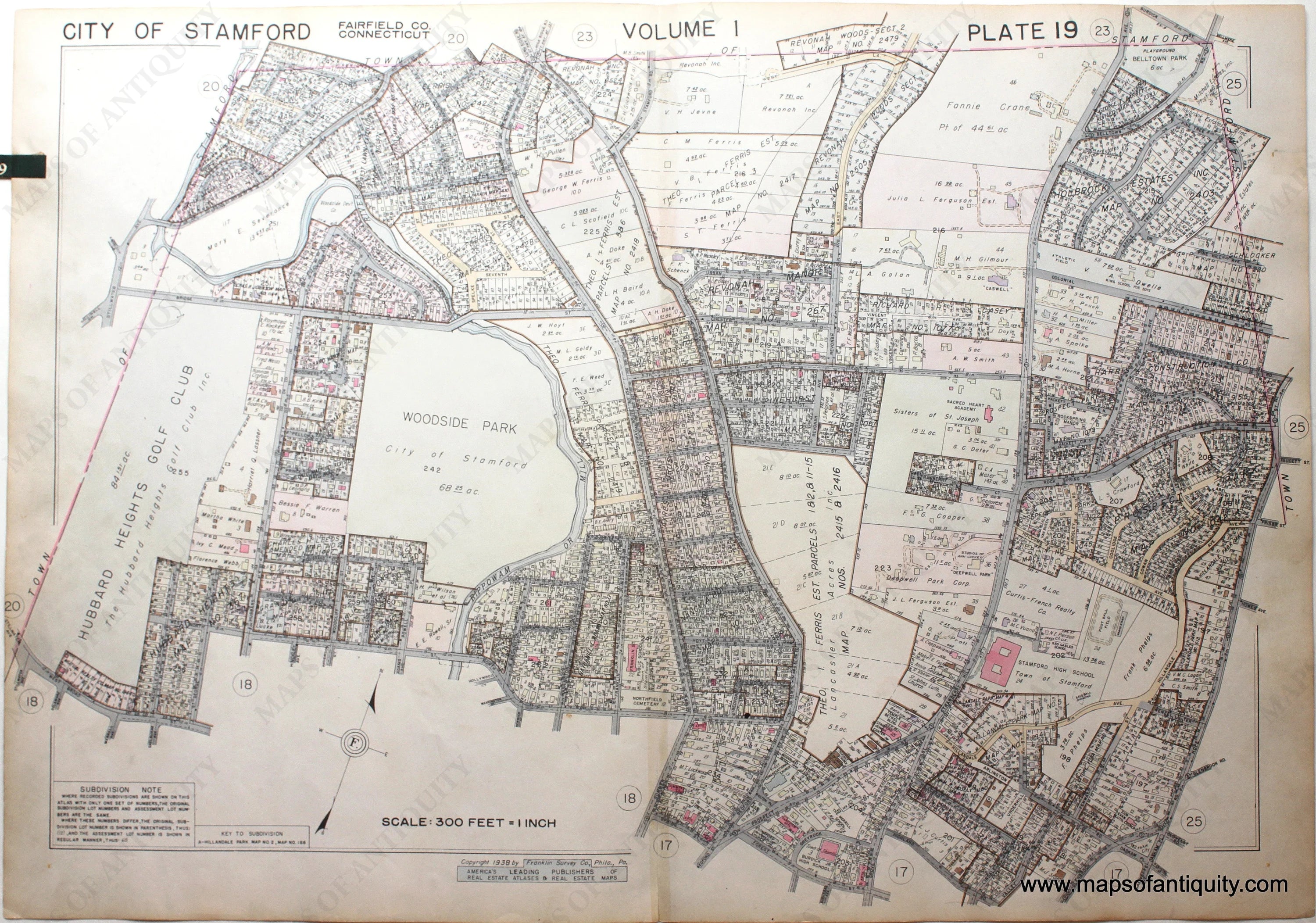 Antique map from the Property Atlas of "Lower" Fairfield County Connecticut, Volume One, published by the Franklin Survey Company, 1938. This map shows part of the city of Stamford CT including Hubbard Heights Golf Club, Woodside Park, Stamford High School, and Belltown Park. Includes roads, railroads, housing developments, and some property owners names. Vibrant original color. Leather tab on left side of page could be removed or hidden for framing. Good antique condition with minor signs of age, such as small, mild stains, some minor damage at the paper edges. A previous owner put tape on the face of the map along the fold. Measures approx. 21 x 31 inches to the neatline.