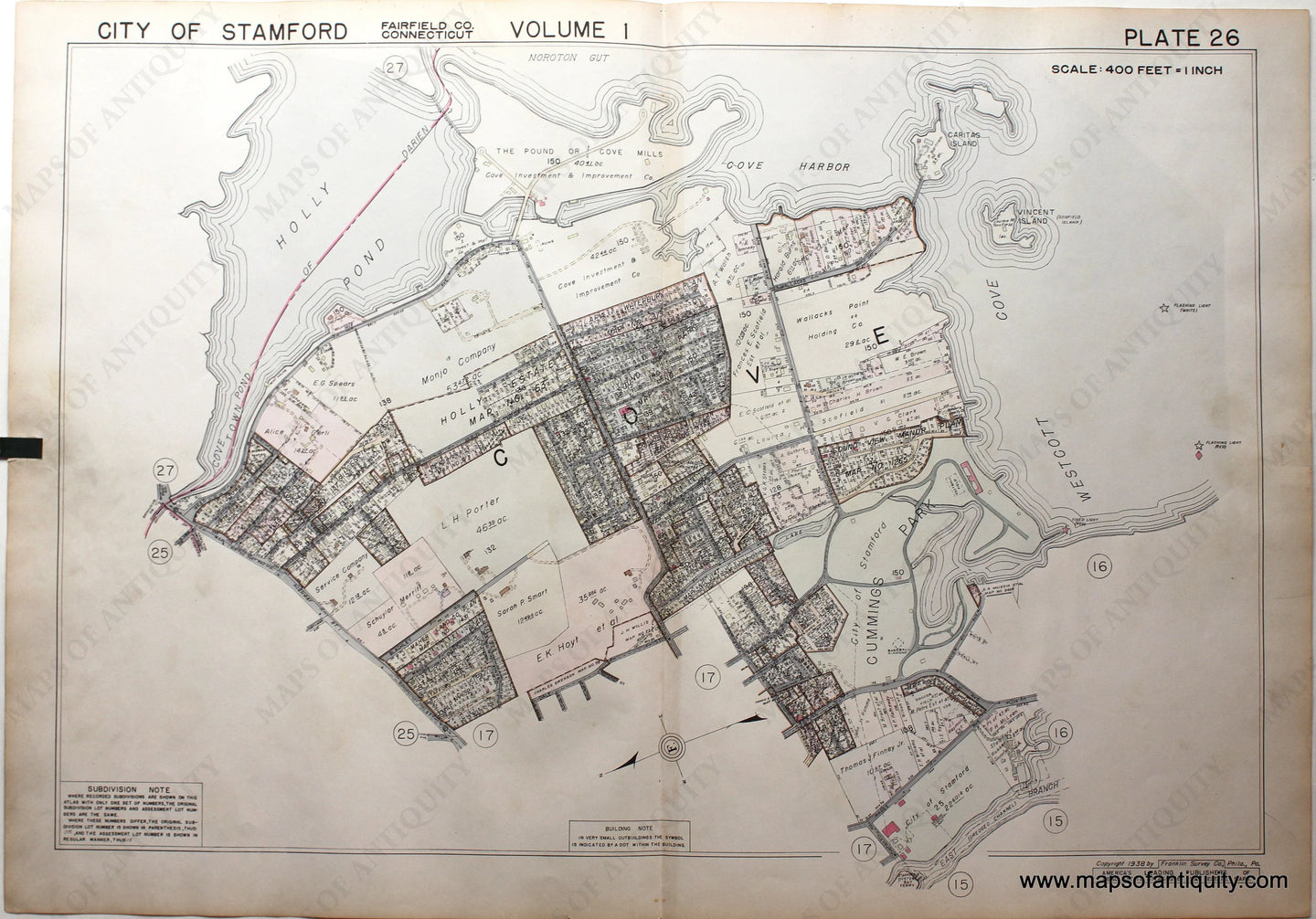 Antique map from the Property Atlas of "Lower" Fairfield County Connecticut, Volume One, published by the Franklin Survey Company, 1938. This map shows part of Stamford CT including the Cove, with Cummings Park, Wescott Cove, Cove Island, Vincent Island, Greenway Island (Caritas Island on the map), and Holly Pond. Includes roads, railroads, housing developments, and some property owners names. Vibrant original color. Leather tab on left side of page could be removed or hidden for framing. Good antique condition with minor signs of age, such as small, mild stains, some minor damage at the paper edges. Measures approx. 21 x 31 inches to the neatline.