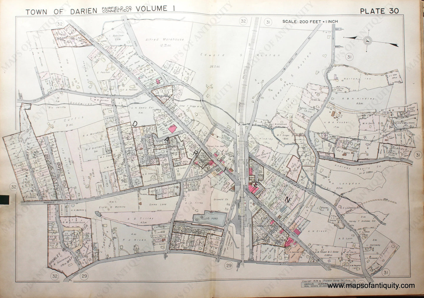 Antique map from the Property Atlas of "Lower" Fairfield County Connecticut, Volume One, published by the Franklin Survey Company, 1938. This map shows part of Darien CT including Darien center with Darien Railroad Station, Tilleys Pond, and Cedar Gate. Includes roads, railroads, housing developments, and some property owners names. Vibrant original color. Leather tab on left side of page could be removed or hidden for framing. Good antique condition with minor signs of age, such as small, mild stains, some minor damage at the paper edges. A previous owner put tape on the face of the map along the fold. Measures approx. 21 x 31 inches to the neatline.