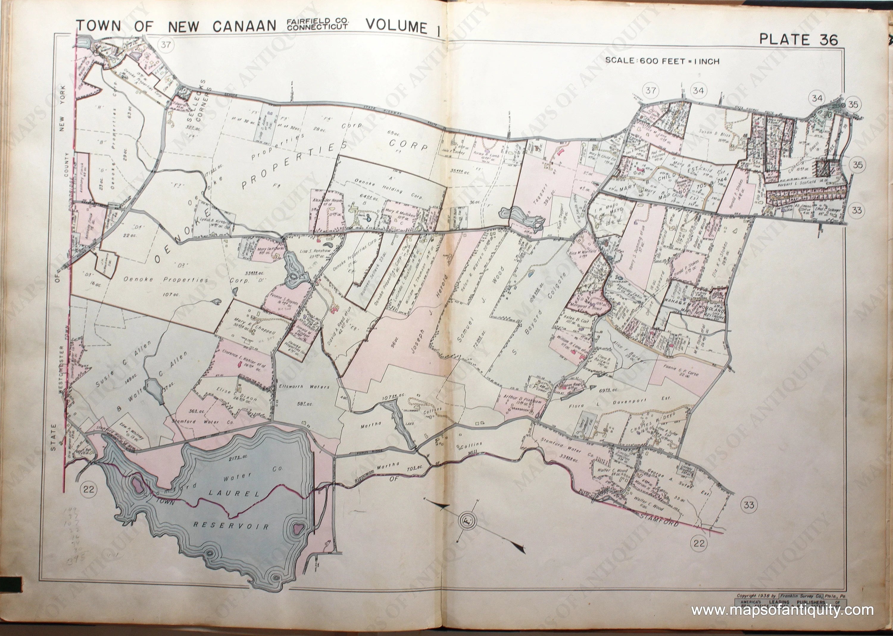 Antique map from the Property Atlas of "Lower" Fairfield County Connecticut, Volume One, published by the Franklin Survey Company, 1938. This map shows part of New Canaan CT including Laurel Reservoir, Sellecks Corner, etc. Includes roads, railroads, housing developments, and some property owners names. Vibrant original color. Leather tab on left side of page could be removed or hidden for framing. Good antique condition with minor signs of age, such as small, mild stains, some minor damage at the paper edges. A previous owner put tape on the face of the map along the fold. Measures approx. 21 x 31 inches to the neatline.
