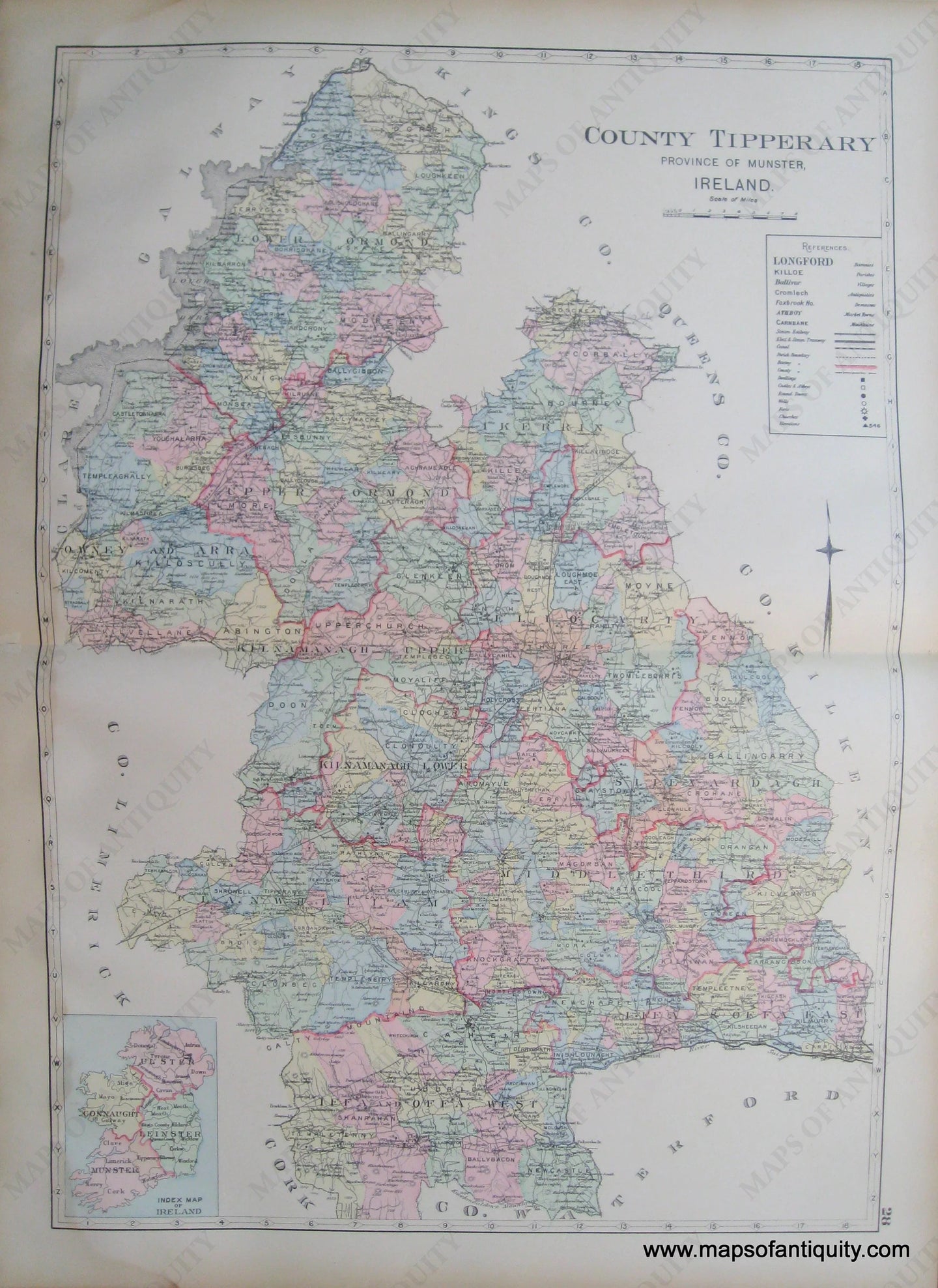 Antique hand colored map from the Memorial Atlas of Ireland Showing Provinces, Counties, Baronies, Parishes, etc., published and printed by L. J. Richards in 1901. With fine details of topography, counties, cities and towns, major roads, railroads, and more. Includes the baronies of Clanwilliam, Eliogarty, Iffa and Offa East, Iffa and Offa West, Ikerrin, Kilnamanagh Lower, Kilnamanagh Upper, Middle Third, Ormond Lower, Ormond Upper, Owney and Arra and Slievardagh. Good antique condition with fold as issued, toning, foxing, general signs of age; paper is quite brittle; archivally repaired tears and slight water damage mostly outside of neatline. Double sheet measures approx. 26 x 17.5 inches to the neatline.