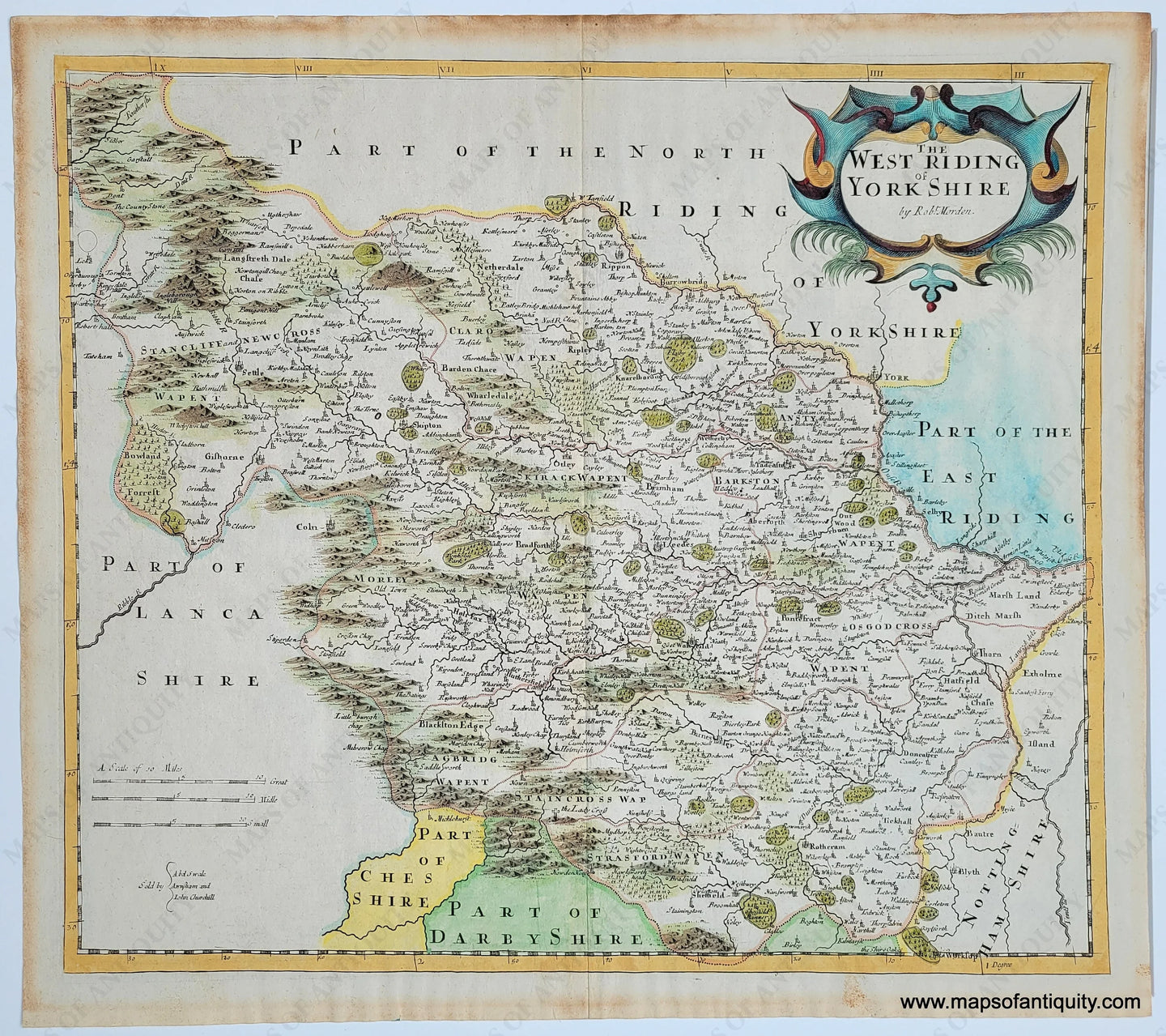Antique hand-colored map of West Riding of Yorkshire, one of three historic subdivisions of Yorkshire, England, by Robert Morden, first published in 1695 and again in 1722. This map is undated and it is unclear in which edition of Camden's "Britannia: Or a Chorographical Description of Great Britain and Ireland Together with the Adjacent Islands..." this map was published. It shows towns, villages, country estates, roads, and more. Topographic information is depicted pictorially. Elegant hand coloring and a handsome cartouche. Very good condition with minor signs of age, such as toning that is darker at the paper edges. Center fold as issued. Measures approx. 14.25 x 16.25 inches to the neatline.