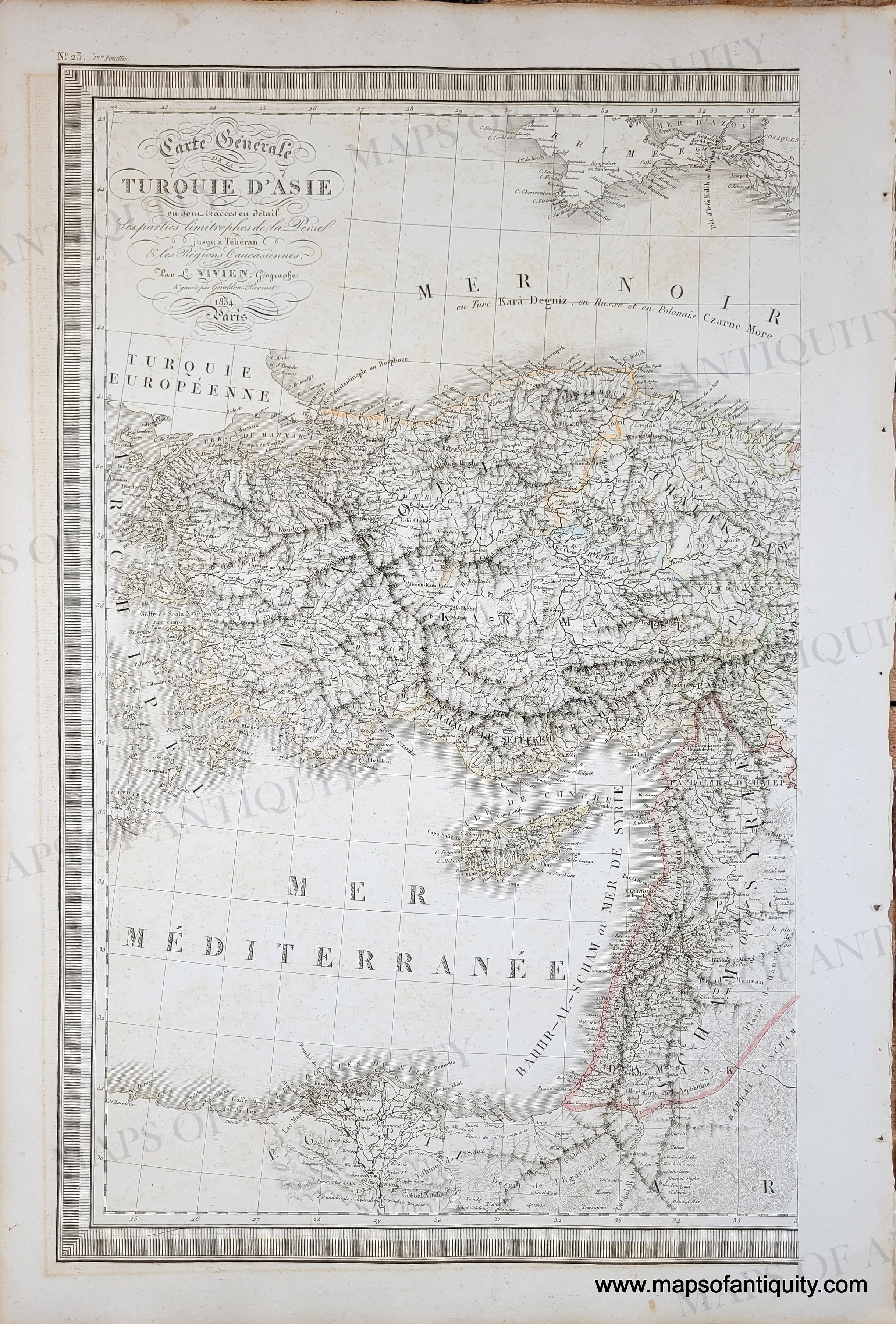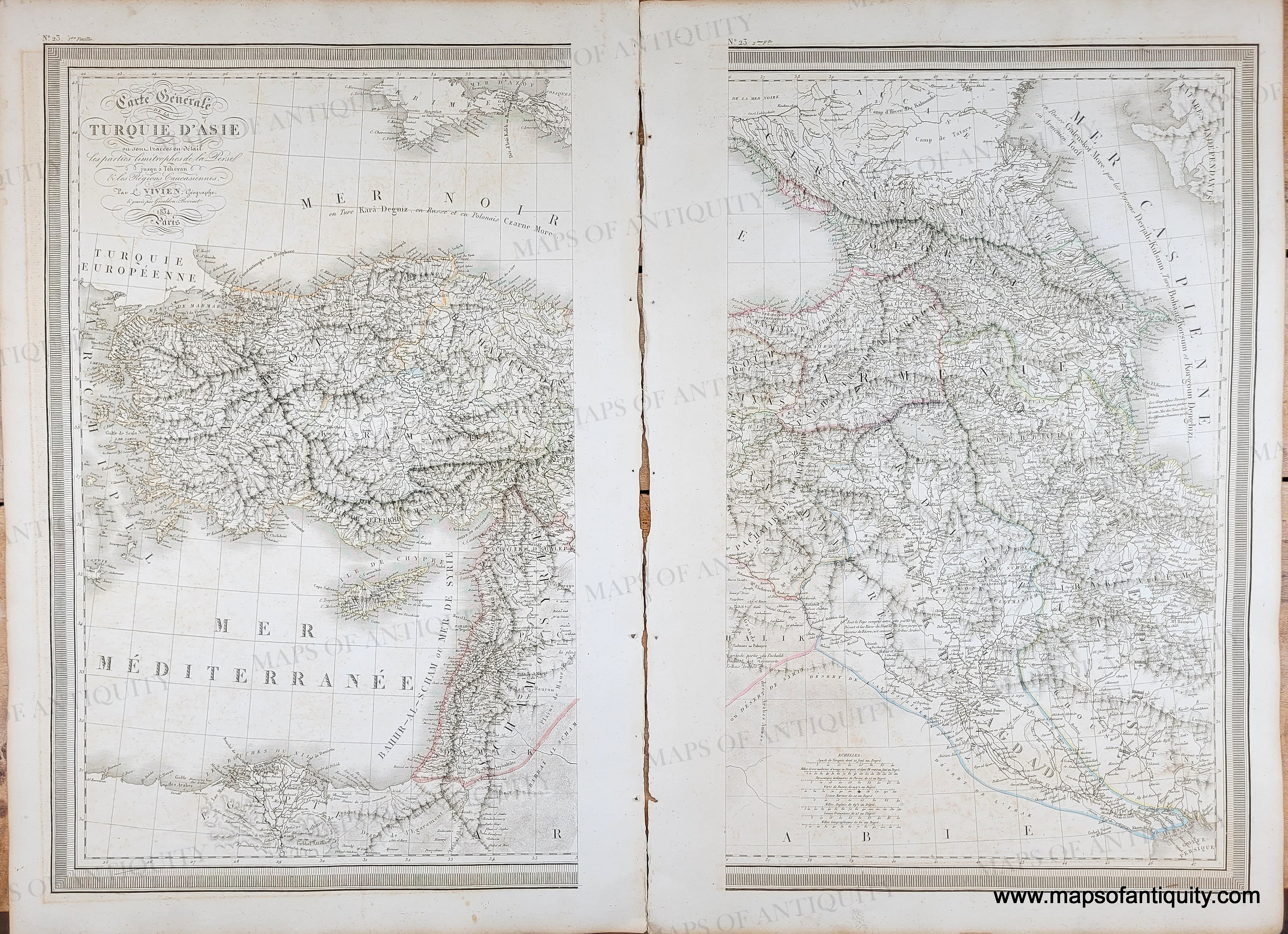 Antique Map of Turkey - Carte Generale de la Turquie d'Asie (2 sheet set) by L. Vivien, 1834. Good antique condition with some image transfer that looks like foxing, mild toning, minor small spots/stains. Measures approx. 18.25 x 11.25 inches to the neatline (each single sheet).