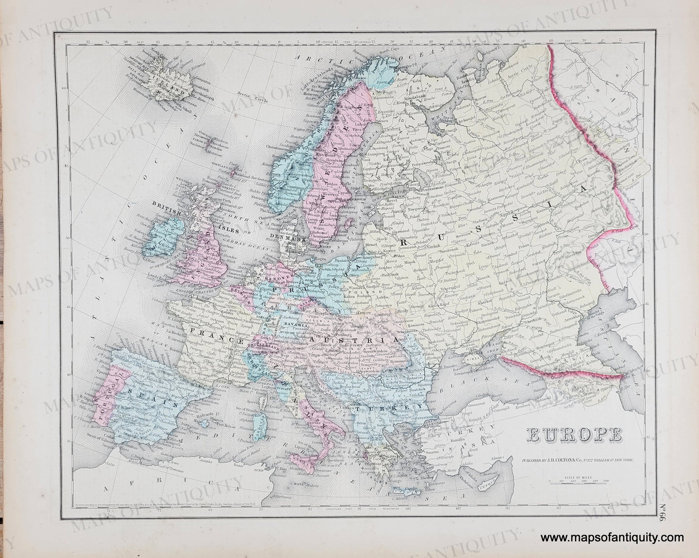 Antique Map of Europe by Colton, 1855. The Colton firm refused to compromise quality, choosing to compete for sales in the finer quality international market rather than the inexpensive domestic one. Because of this, all maps were engraved by steel plates rather than by wax engraving which was the most common method used at this time. Very good antique condition with mild toning, some small spots and some small wear/tears at the paper edges. Measures approx. 15.5 x 12.5 inches to the decorative border.