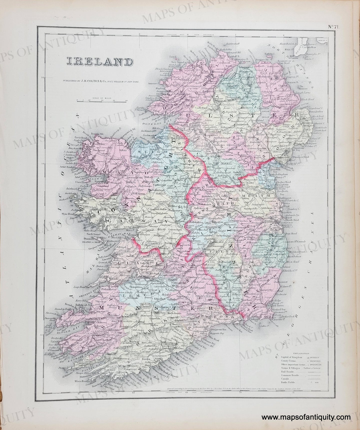 Antique Map of Ireland by Colton, 1855. The Colton firm refused to compromise quality, choosing to compete for sales in the finer quality international market rather than the inexpensive domestic one. Because of this, all maps were engraved by steel plates rather than by wax engraving which was the most common method used at this time. Very good antique condition with mild toning, some small spots and some small wear/tears at the paper edges. Measures approx. 15.5 x 12.5 inches to the decorative border.