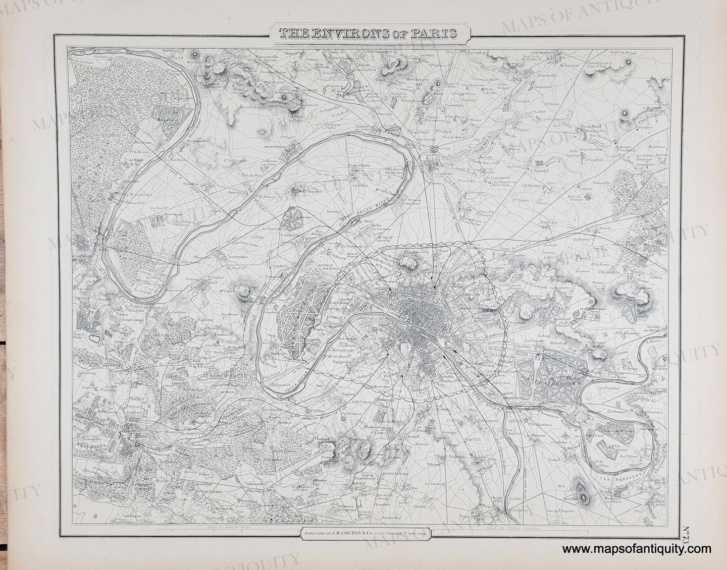 Antique Map of The Environs of Paris by Colton, 1855. The Colton firm refused to compromise quality, choosing to compete for sales in the finer quality international market rather than the inexpensive domestic one. Because of this, all maps were engraved by steel plates rather than by wax engraving which was the most common method used at this time. Very good antique condition with mild toning, some small spots and some small wear/tears at the paper edges. Measures approx. 15.5 x 12.5 inches to the decorative border.