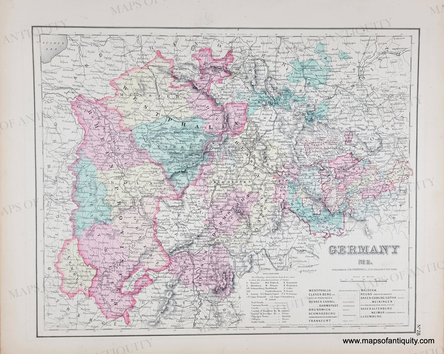 Antique Map of Germany No. 2 by Colton, 1855. The Colton firm refused to compromise quality, choosing to compete for sales in the finer quality international market rather than the inexpensive domestic one. Because of this, all maps were engraved by steel plates rather than by wax engraving which was the most common method used at this time. Very good antique condition with mild toning, some small spots and some small wear/tears at the paper edges. Measures approx. 15.5 x 12.5 inches to the decorative border.