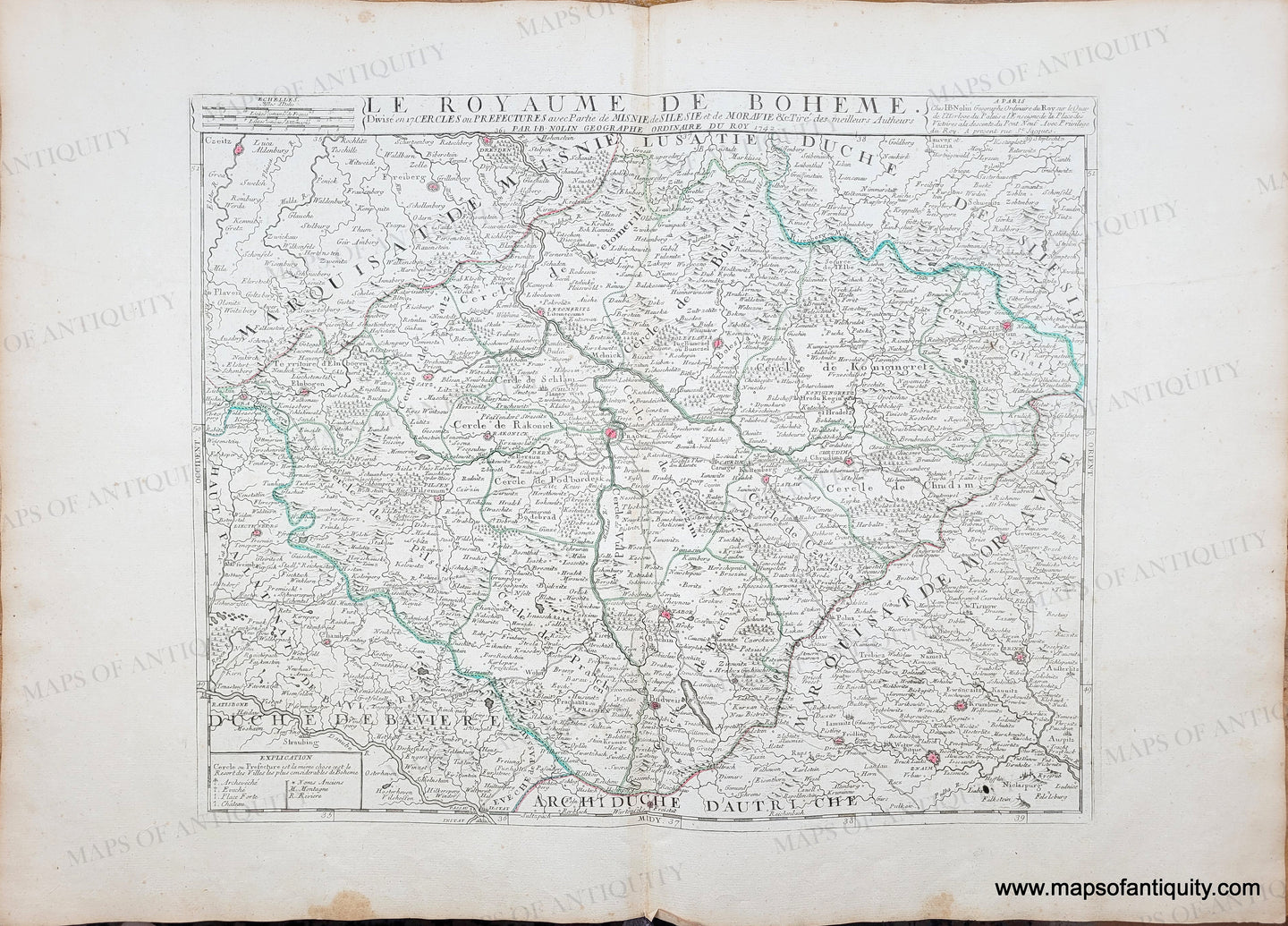 18th century map with original hand-colored boundary lines in yellow, green, red, blue. Genuine-Antique-Map-Czechia-Bohemia-Le-Royaume-de-Boheme-1775-Nolin-Maps-Of-Antiquity