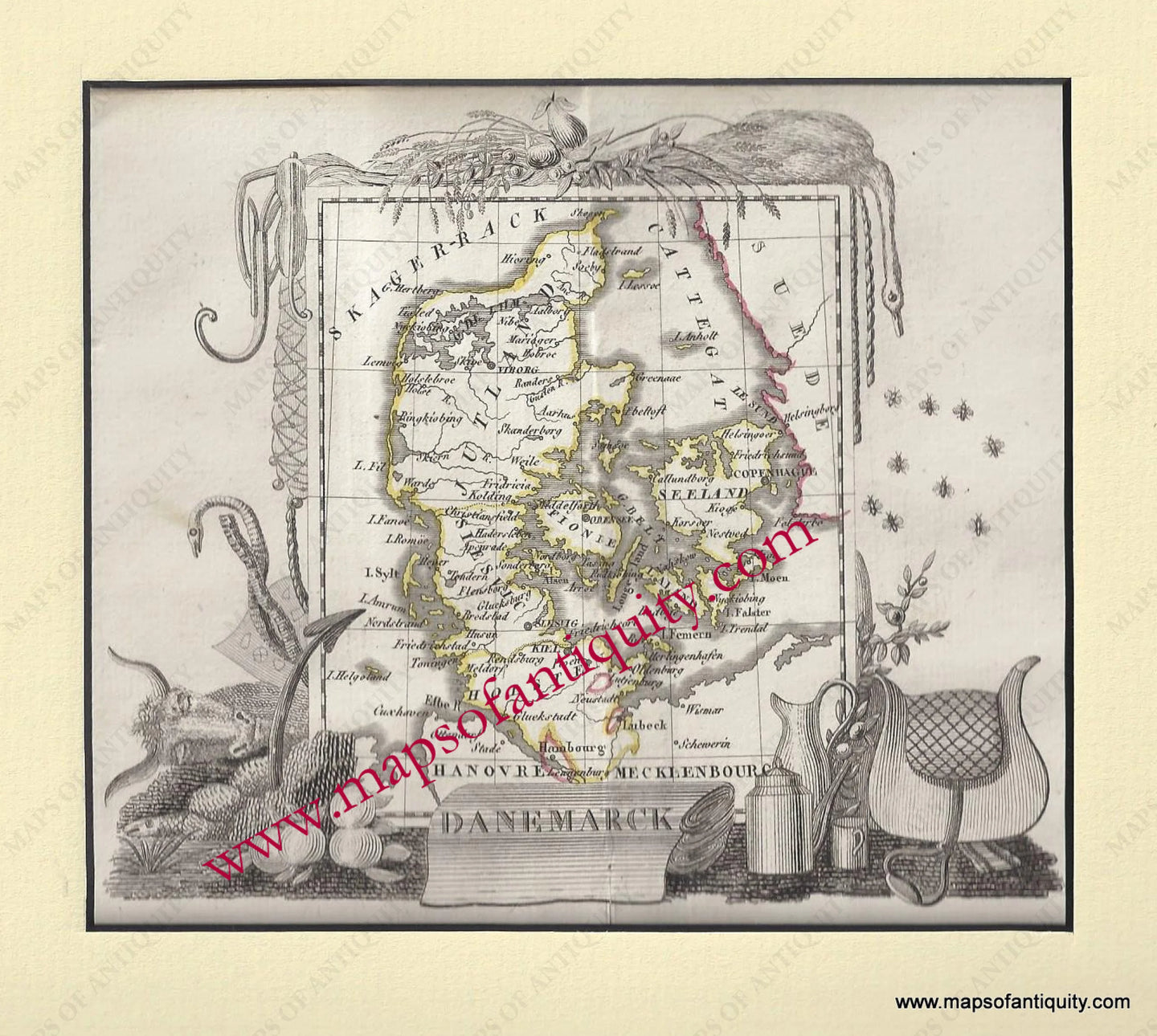 Antique hand colored map of Denmark with decorative border featuring the countries' flora, fauna, achievements, and notable people. Published by Perrot circa 1822. Matted in neutral mat. Very good overall antique condition with center fold as issued. approx. 5 x 5.5 inches to edge of printed area and a 2.25 inch mat.