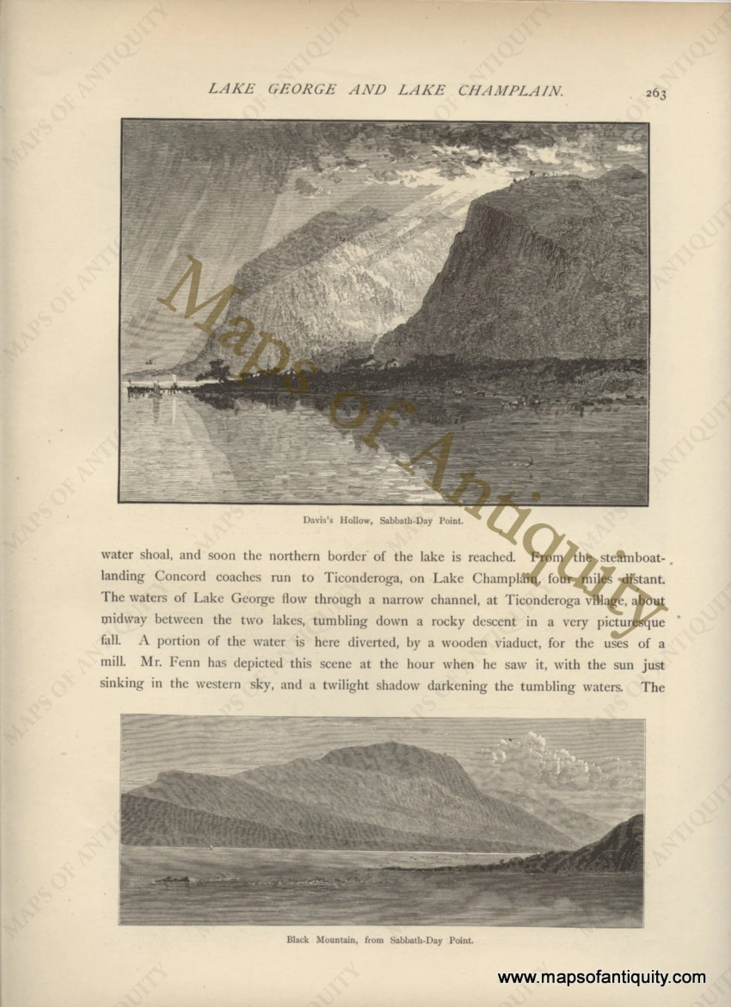 Antique black and white illustration of Lake George scenes, from Picturesque America. Very good overall antique condition, page measures approx. 10.25 x 7 inches.