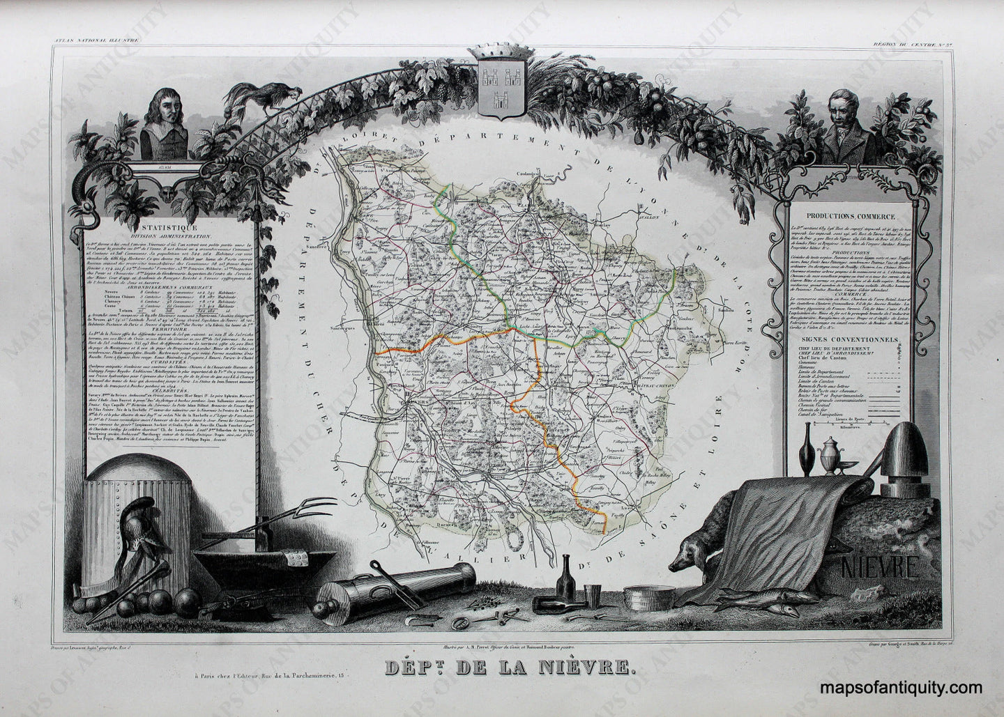 From the Atlas National Illustre des 86 Departments et des Possessions de la France, Divise par Arrondissements, Cantons et Communea, by Levasseur, 1851. Surrounded by exquisitely detailed engraved illustrations and vignettes, as well as statistical and general information. Very good condition, approx. 12 x 17.25 inches.