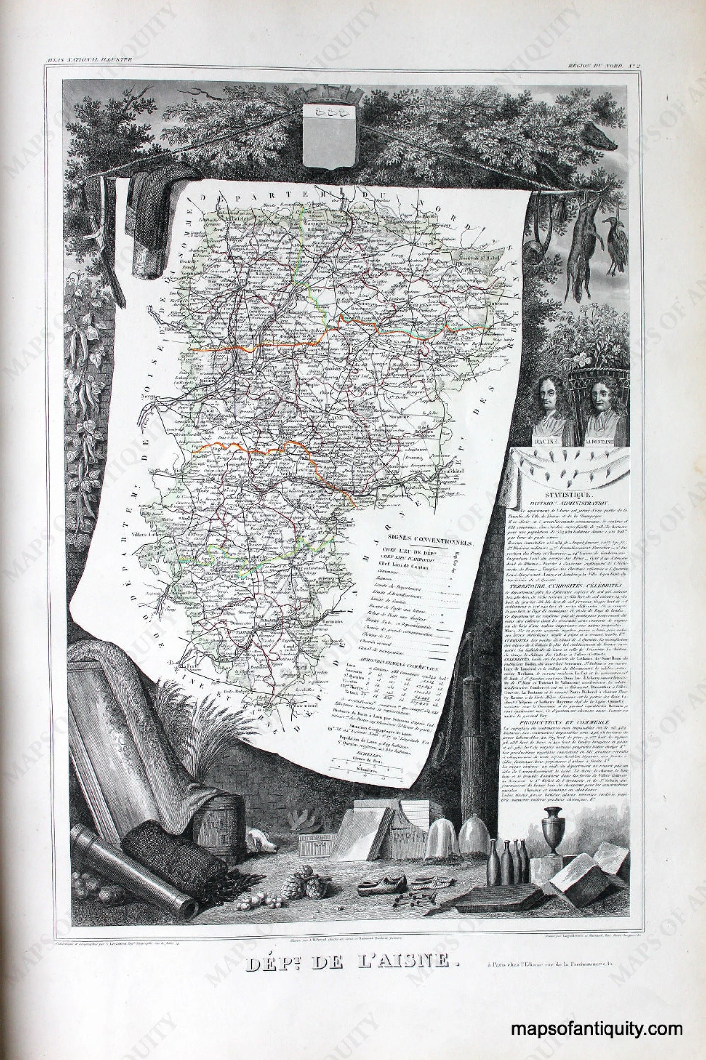 Antique-Hand-Colored-Map-Dept.-de-L'Aisne.-Europe-France-1851-Levasseur-Maps-Of-Antiquity