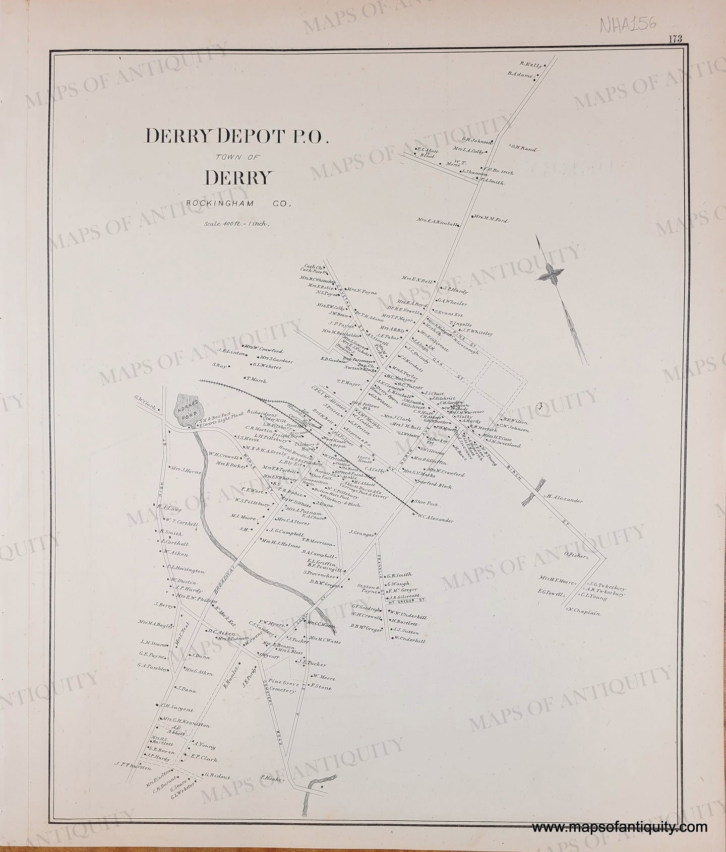 Antique black and white map of the neighborhood/vicinity around the Derry Depot Post Office in Derry, New Hampshire. Includes the names of property owners at the time of publication. From the Town and City Atlas of the State of New Hampshire, by D.H. Hurd, 1892. Very Good antique condition with mild toning throughout, and a few spots of very minor foxing. Measures approx. 13 x 17.25 inches.