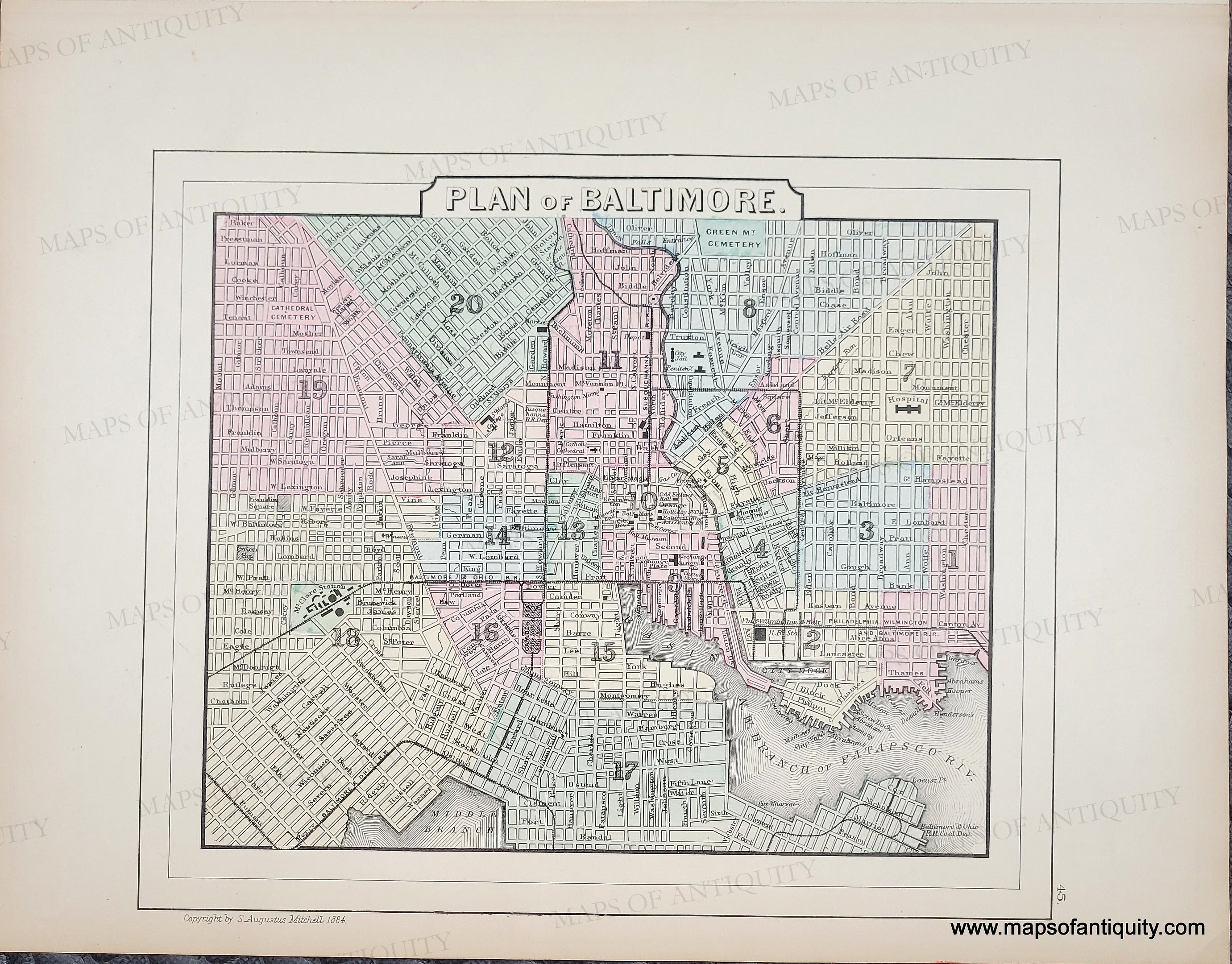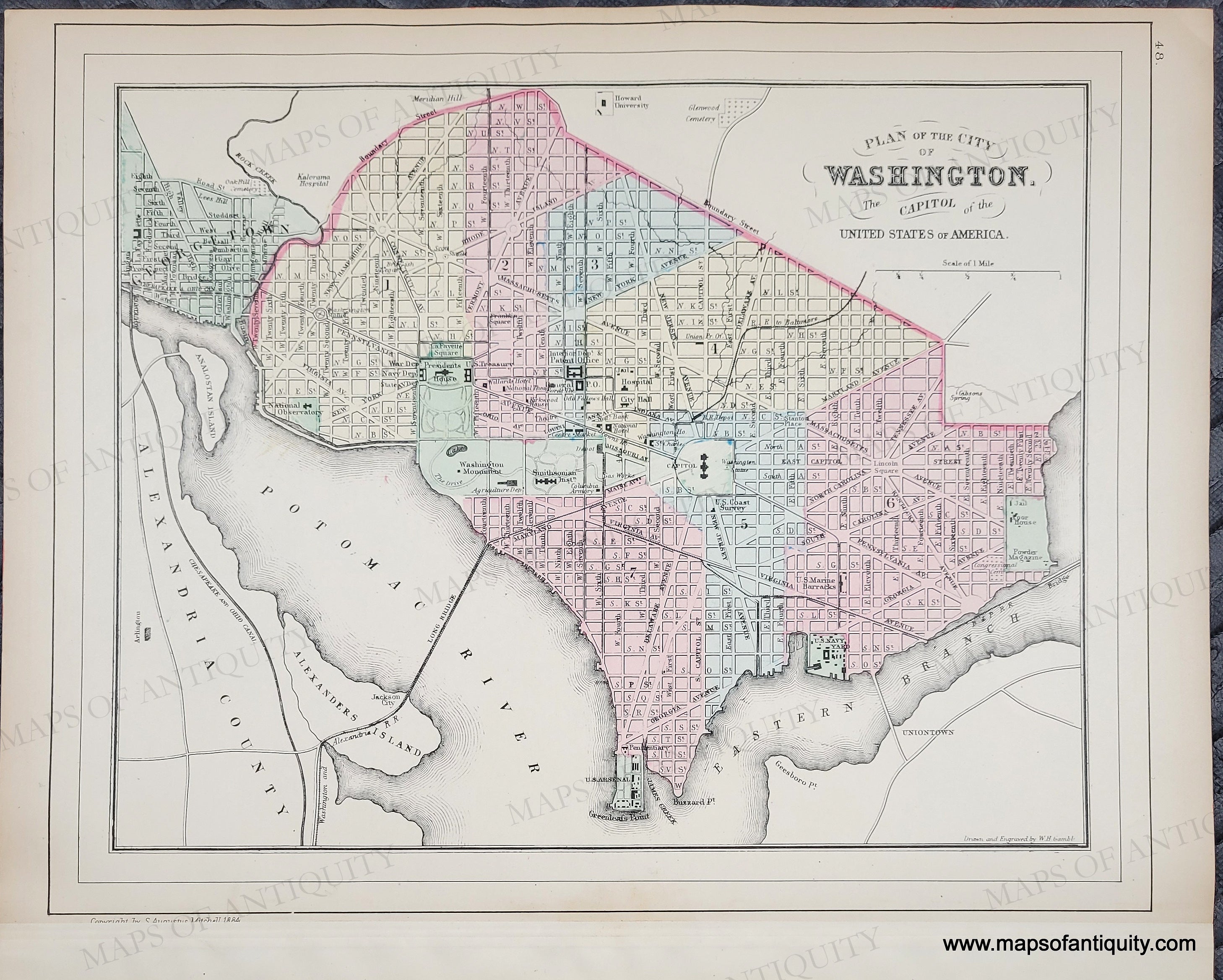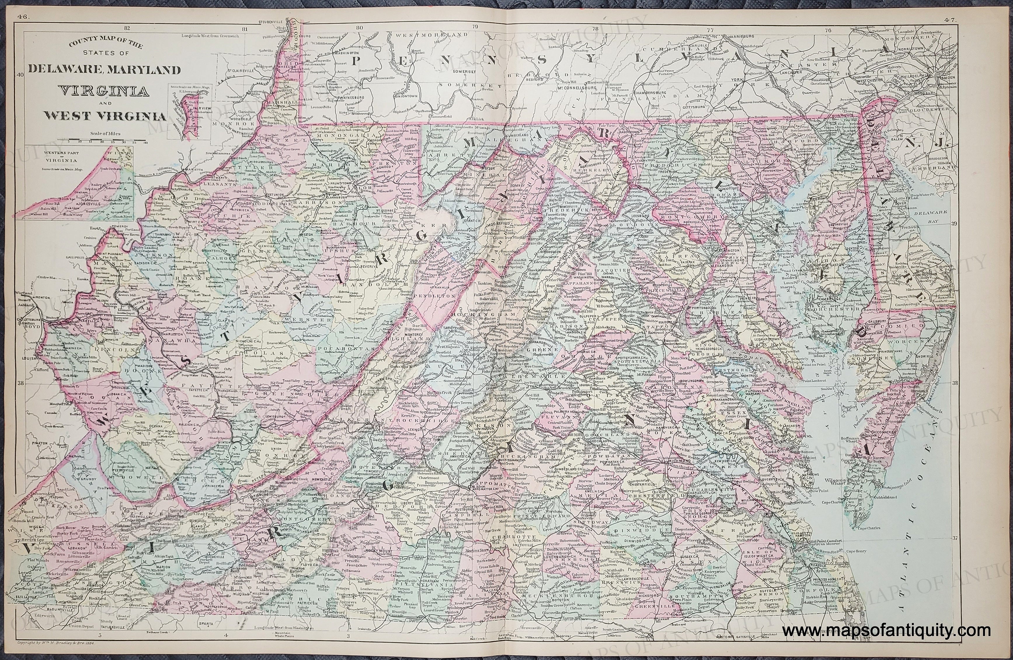 Antique hand-colored maps from Mitchell's 1885 New General Atlas. The centerfold map shows the states of Delaware, Maryland, Virginia, and West Virginia, colored by county, showing political boundaries, cities, water bodies, as well as land features. Includes towns with names. On the back side is a map of Washington DC on one side, and a map of Baltimore MD on the other side. This map is in very good antique condition with minor overall toning. Some separation at the edges along the fold. Paper is a bit fragile. Centerfold map measures approximately 14.25 x 21 inches to the outer neatline. Washington DC map measures approx. 11 x 14 inches to the neatline. Baltimore map measures approx. 9.5 x 11 inches to the outer neatline.