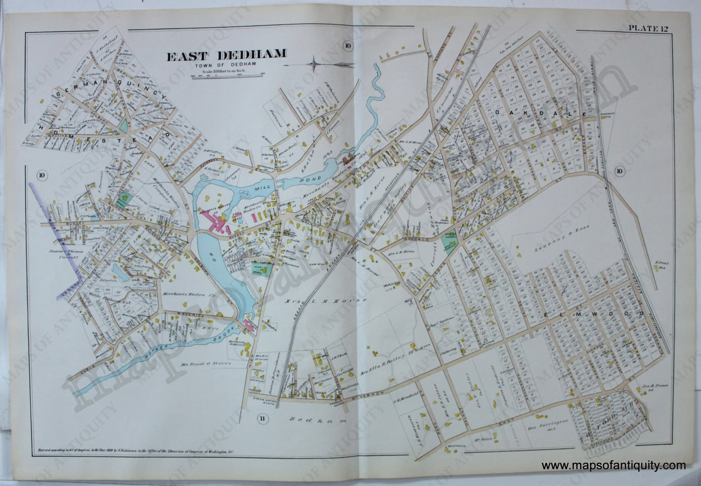 From the Atlas of Norfolk County, by Robinson, 1888. Antique hand colored map of East Dedham. Includes property owners' names and building footprints, etc. Very good overall antique condition with mild toning throughout. Double sheet measures approx. 18.5 x 28.25 inches.