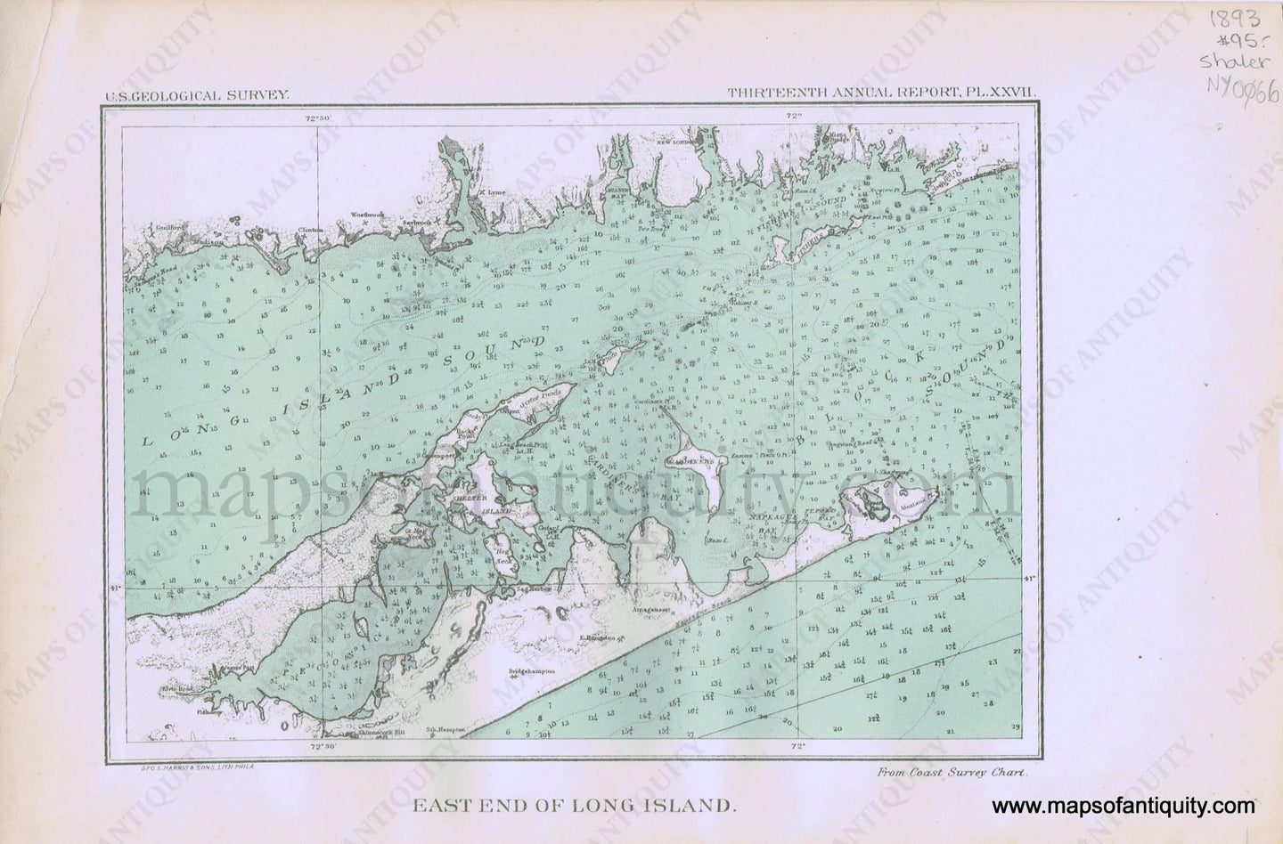 Antique printed color coastal report chart of the eastern end of Long Island, New York, by the US Geological Survey and published in Shaler's 1893 The Geological History of Harbors. Includes Peconic Bay, Gardiners Bay, Napeague Bay, Shelter Island, Gardiner's Island, Plum Island, Montauk Point, Fishers Island, Block Island Sound, etc. Very good overall antique condition with mild toning throughout, areas of minor foxing, and some creasing/edge wear- specifically along the left edge of the paper. Map measures approximately 5.75" x 8.25" (H x W) to the neatline.