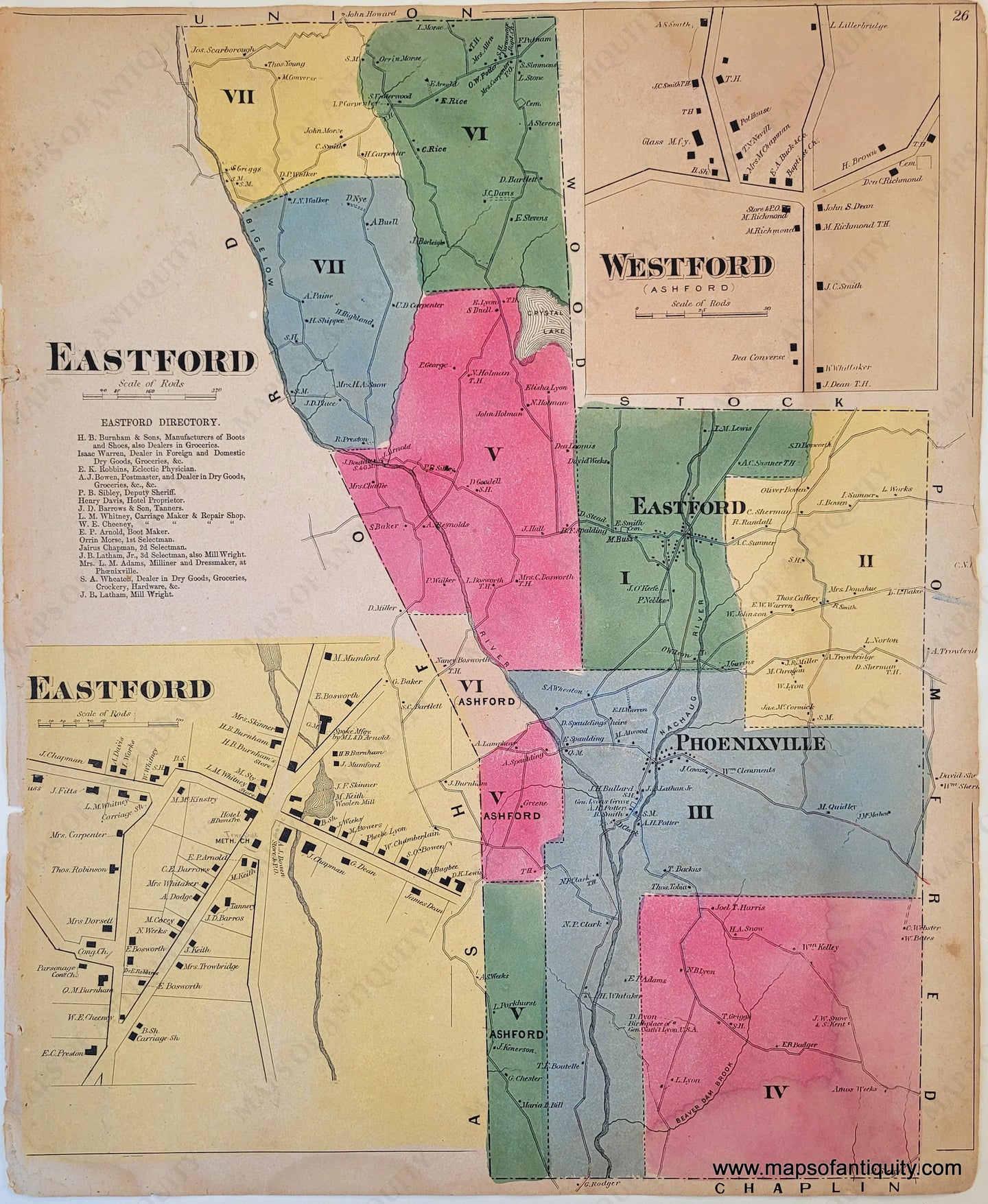 Antique map of Eastford, Connecticut, from the Atlas of Windham and Tolland Counties Conn., published by Keeney, 1869. Inset maps of the villages of Eastford and Westford (part of Ashford). Fair antique condition with some water stains, some small spots, some wear at the paper edges. Measures approx. 18 x 14.75 inches to the edges of the paper.