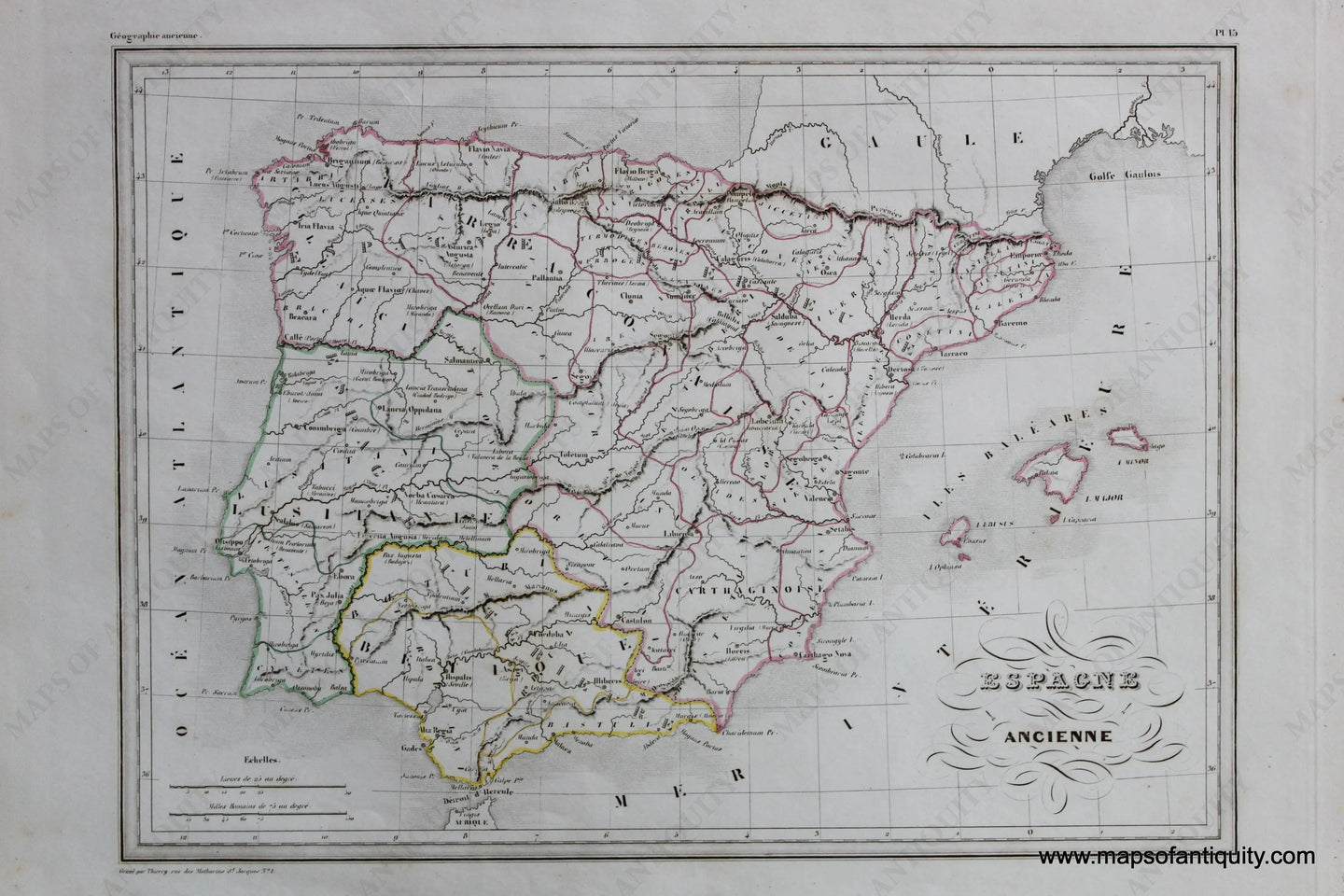 Antique hand colored map of ancient Spain. Written in French. Very good condition with some light toning and marks around the edges. By Malte-Brun, in the Atlas Du Precis De La Geographie Universelle, 1846. Approximately 8.5" x 11.75"