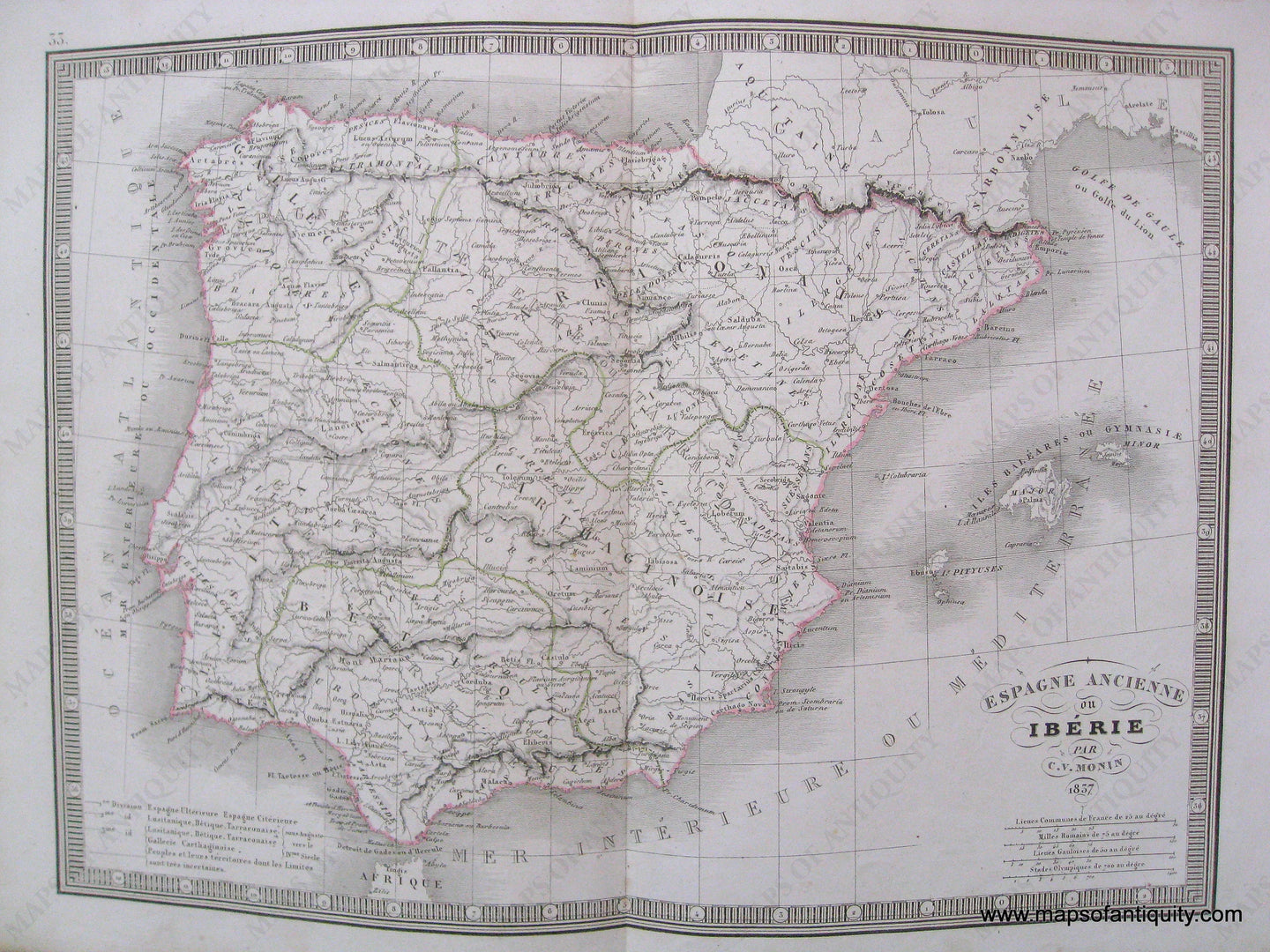 Hand colored outlined antique map from the 1846 issue of atlas Classique de La Geographie Ancienne, du Moyen Age, et Moderne, a L'Usage des Colleges et des Pensiones pour servir a L'Etude de La Geographie et de L'Histoire, corrige et augemnte Par M. Monin, ingenieur-Geographe, membre de la Societe de Geographie.Moyen Age, et Moderne. In good antique condition with toning, foxing, discoloration at edges, general signs of age, center fold as issued, ink spots outside neatline. Measures approximately 10.5 x 14 inches.