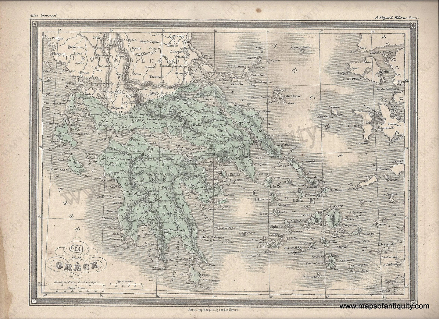Antique hand colored map of part of Greece, published by Fayard in the "Atlas Universel," 1877. Map is written in French and includes topographical detail. Includes many of the islands, such as Santorini, Naxos, Mykonos, and more. Good overall antique condition with mild toning throughout, and some stains in the margins that can be hidden when framed. Measures approximately 10" x 7.75" to the neatline.