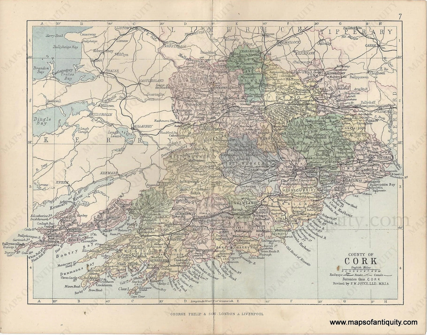Antique printed color map from Philips' Handy Atlas of the Counties of Ireland, constructed by John Bartholomew, revised by P.W. Joyce, published by George Philip & Son in 1884. Very good condition with minor signs of age. Measures approx. 7.25 x 9 inches to the paper edges.