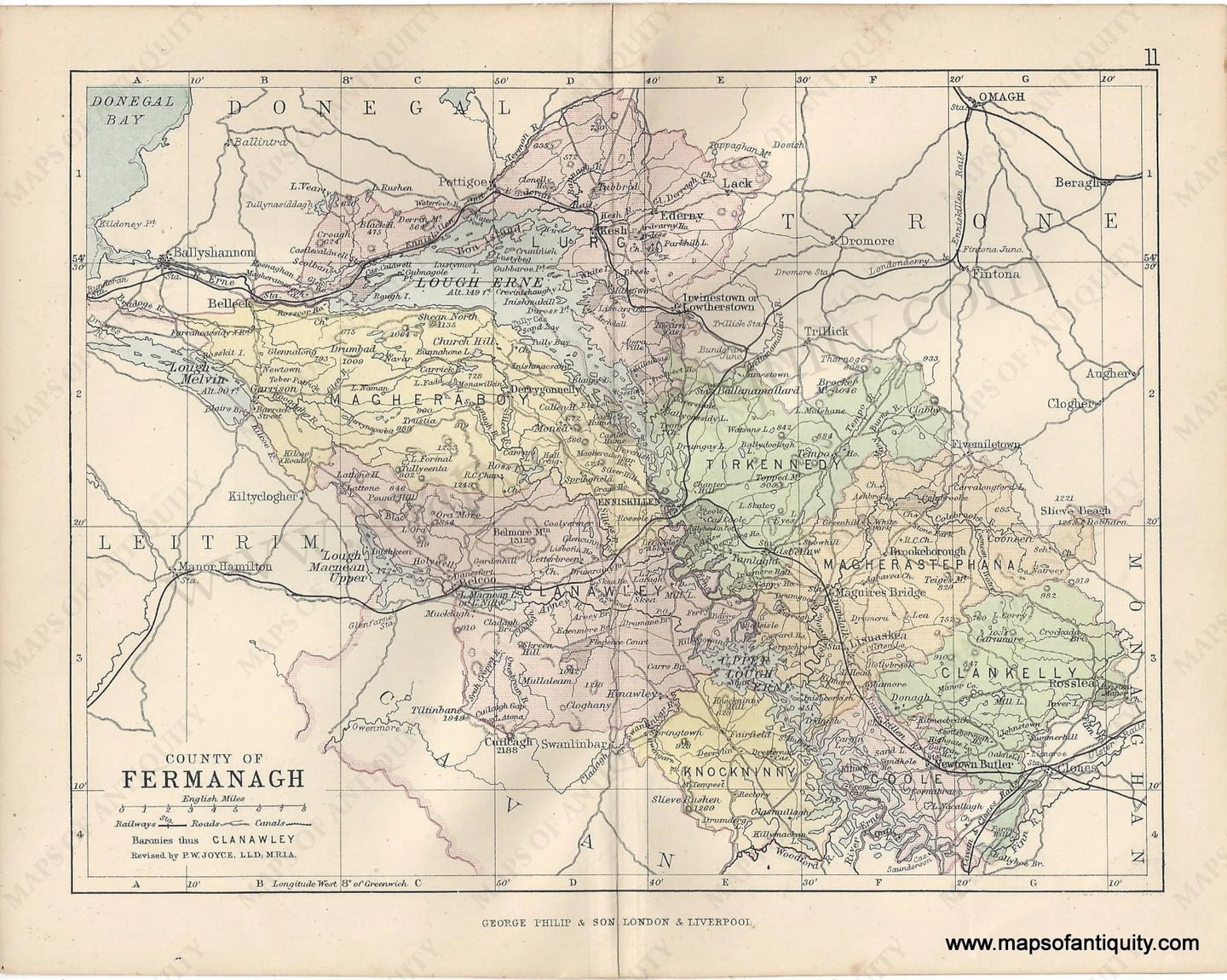 Antique printed color map from Philips' Handy Atlas of the Counties of Ireland, constructed by John Bartholomew, revised by P.W. Joyce, published by George Philip & Son in 1884. Very good condition with minor signs of age. Measures approx. 7.25 x 9 inches to the paper edges.