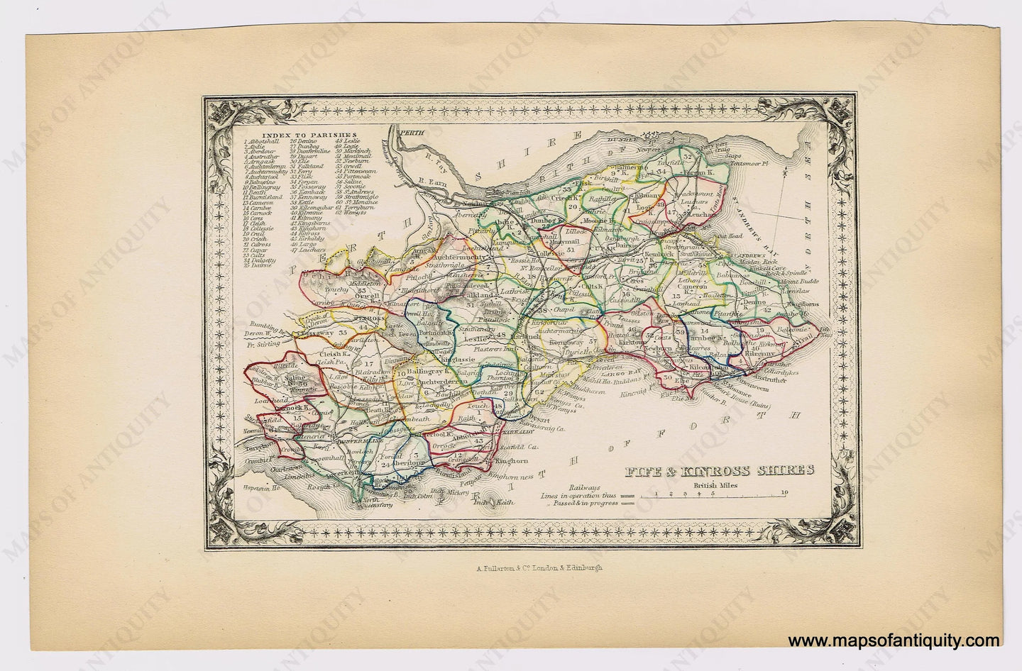 Antique hand-colored map of Fife and Kinross-shire in Scotland, published in the County Atlas of Scotland by A. Fullarton & Co., c. 1855. This map has an index to the parishes, some topography, railways ( in operations as well as in progress), towns and cities. Measured in British Miles and surrounded by a decorative border. These maps were published in an undated atlas, but based on the progress of the railways shown on the maps, it was likely published around 1855. Very good antique condition with some very minor spots and signs of age. Measures approx. 4.75 x 6.75 inches to the neatline.