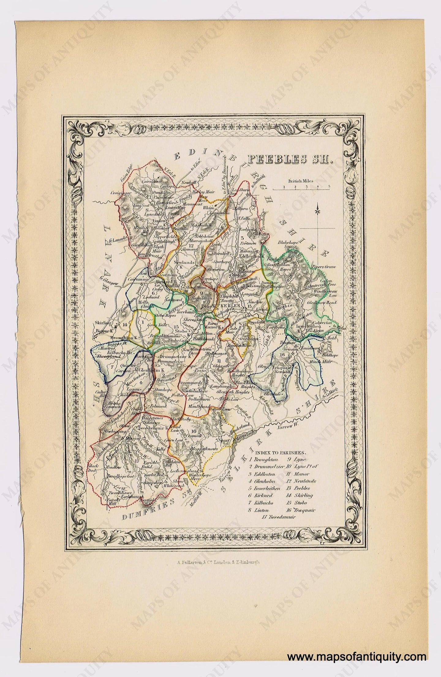 Antique hand-colored map of Peebleshire in Scotland, published in the County Atlas of Scotland by A. Fullarton & Co., c. 1855. This map has an index to the parishes, some topography, towns and cities. Measured in British Miles and surrounded by a decorative border. These maps were published in an undated atlas, but based on the progress of the railways shown on the maps, it was likely published around 1855. Very good antique condition with some very minor spots and signs of age. Measures approx. 6.75 x 4.75 inches to the neatline.
