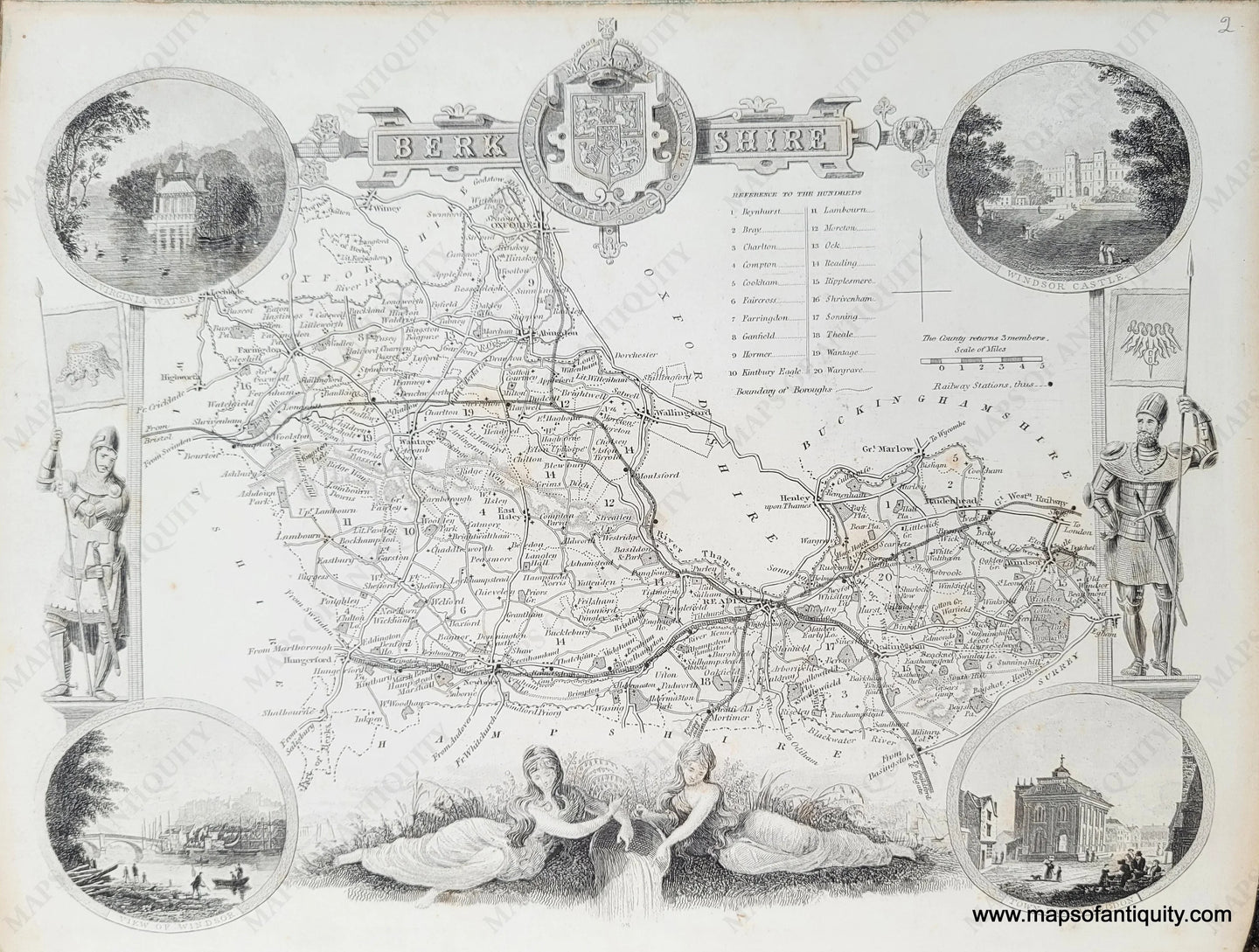 Antique map from the Atlas to Barclay's Universal English Dictionary, Newly Revised by B.B. Woodward, published by Virtue & Company circa 1850. Undated. With an exquisitely detailed border featuring architectural details, local edifices, coats of arms, and a Reference to the Hundreds. Very good antique condition, backed on fabric with some minor spots and stains mostly at the paper edge. Measures approx. 11 x 8.5 inches to the paper edges.