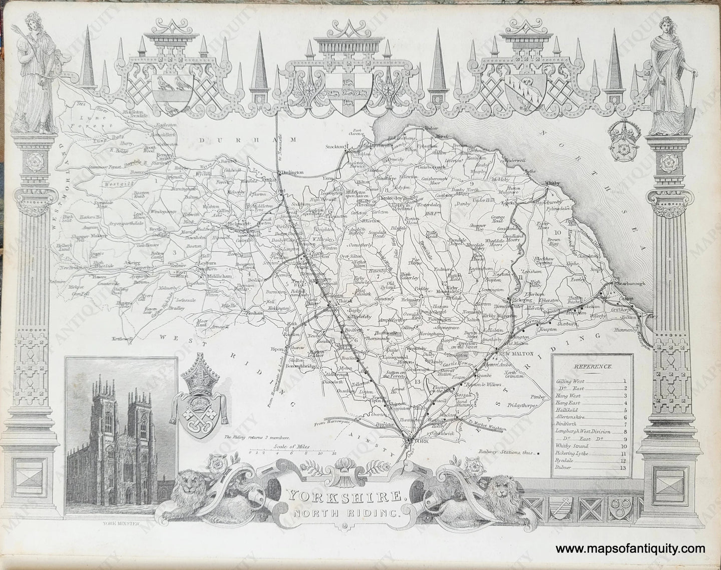 Antique map from the Atlas to Barclay's Universal English Dictionary, Newly Revised by B.B. Woodward, published by Virtue & Company circa 1850. Undated. With an exquisitely detailed border featuring architectural details, local edifices, coats of arms, and a Reference to the Hundreds. Very good antique condition, backed on fabric with some minor spots and stains mostly at the paper edge. Measures approx. 11 x 8.5 inches to the paper edges.