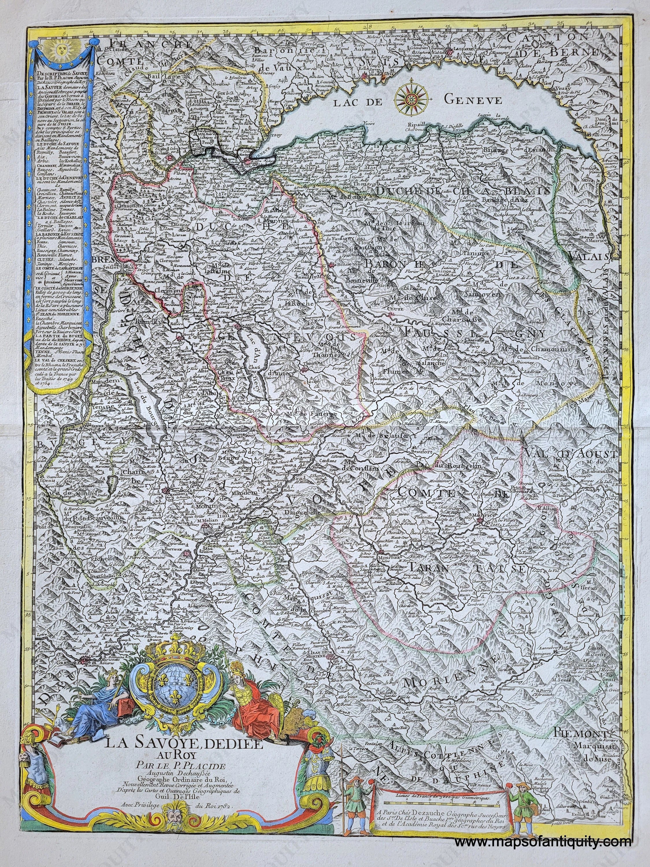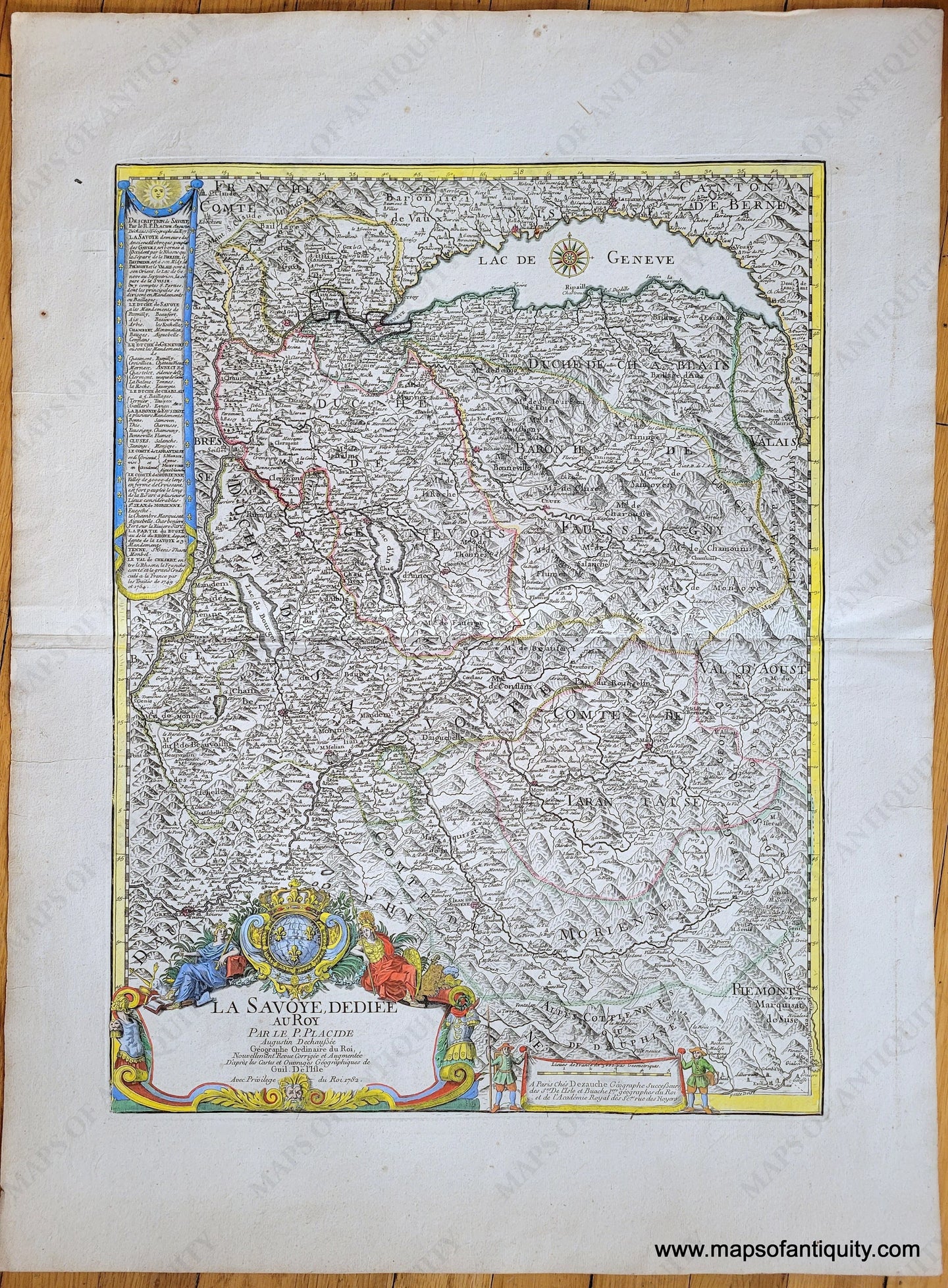 Antique map of part of south-eastern France, by Placide, published by Dezauche, successor to De l'Isle, 1782. This map includes Lake Geneva at top, with the French Alps, Chamonix, Moutiers, and many more towns and cities, some roads, with mountains named and unnamed, including Mont Blanc. The first recorded ascent of Mont Blanc (at the time neither within Italy nor France) was on 8 August 1786 by Jacques Balmat and the doctor Michel Paccard. This climb, initiated by Horace-Bénédict de Saussure, who gave a reward for the successful ascent, traditionally marks the start of modern mountaineering. The first woman to reach the summit was Marie Paradis in 1808. This handsome map features a decorative cartouche, scale of miles, and description, and a compass rose in Lake Geneva. Very good antique condition with a few small spots mostly in the margin. With a fold as issued. Measures approx. 22.5 x 16.75 inches to the neatline.