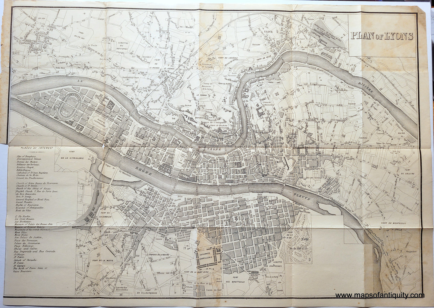 Antique map of Lyons, France, by Bradshaw, c. 1895. Shows roads, railroads, parks, gardens, cemeteries, and notable buildings. Fair to good antique condition with light overall toning, some foxing, tight margin on left, and some small holes and tears at the folds. Measures approx. 11.25 x 15.75 inches to the neatline.